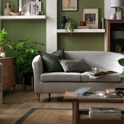 Comfy foam and fibre filled seats, slim armrests, plump bolster cushions and splayed light wood legs add to Andy's contemporary chaise charm.