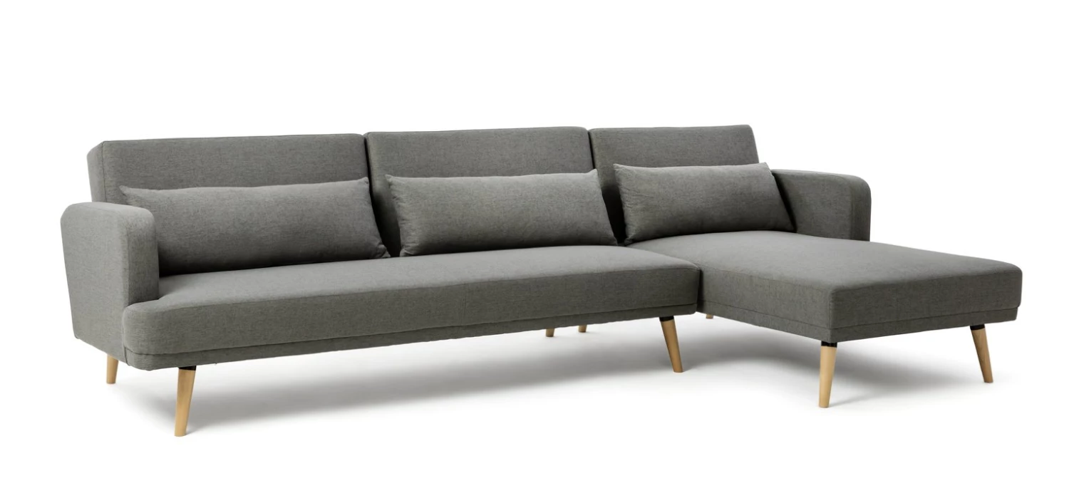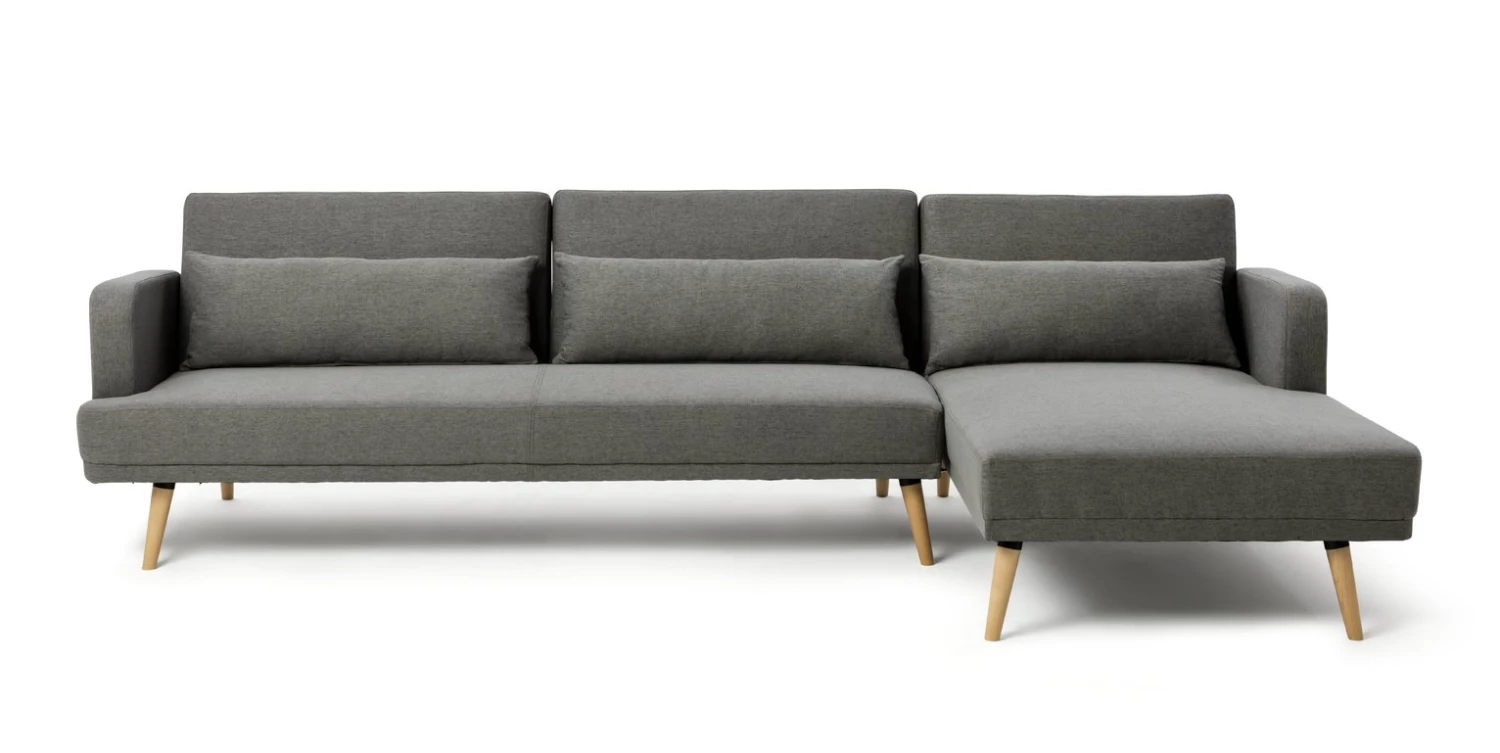 Chaise lounge, chaise sleep. Here's a practical solution to a spare bed problem that's doesn't compromise on style. Upholstered in grey fabric, our right corner sofa bed displays its clean modern lines and generous seating. Need a spare bed? With a simple, click, clack movement our 3 seater chaise sofa bed folds down into a compact double. Very handy, Andy.