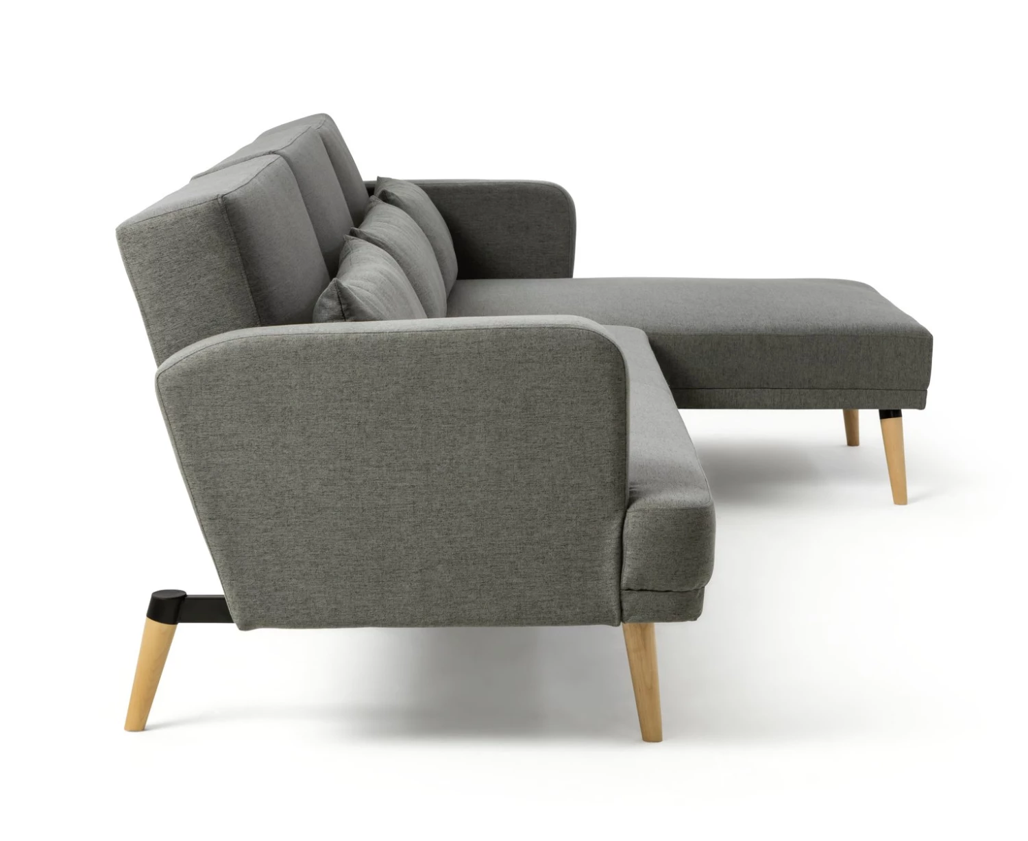 Comfy foam and fibre filled seats, slim armrests, plump bolster cushions and splayed light wood legs add to Andy's contemporary chaise charm.
