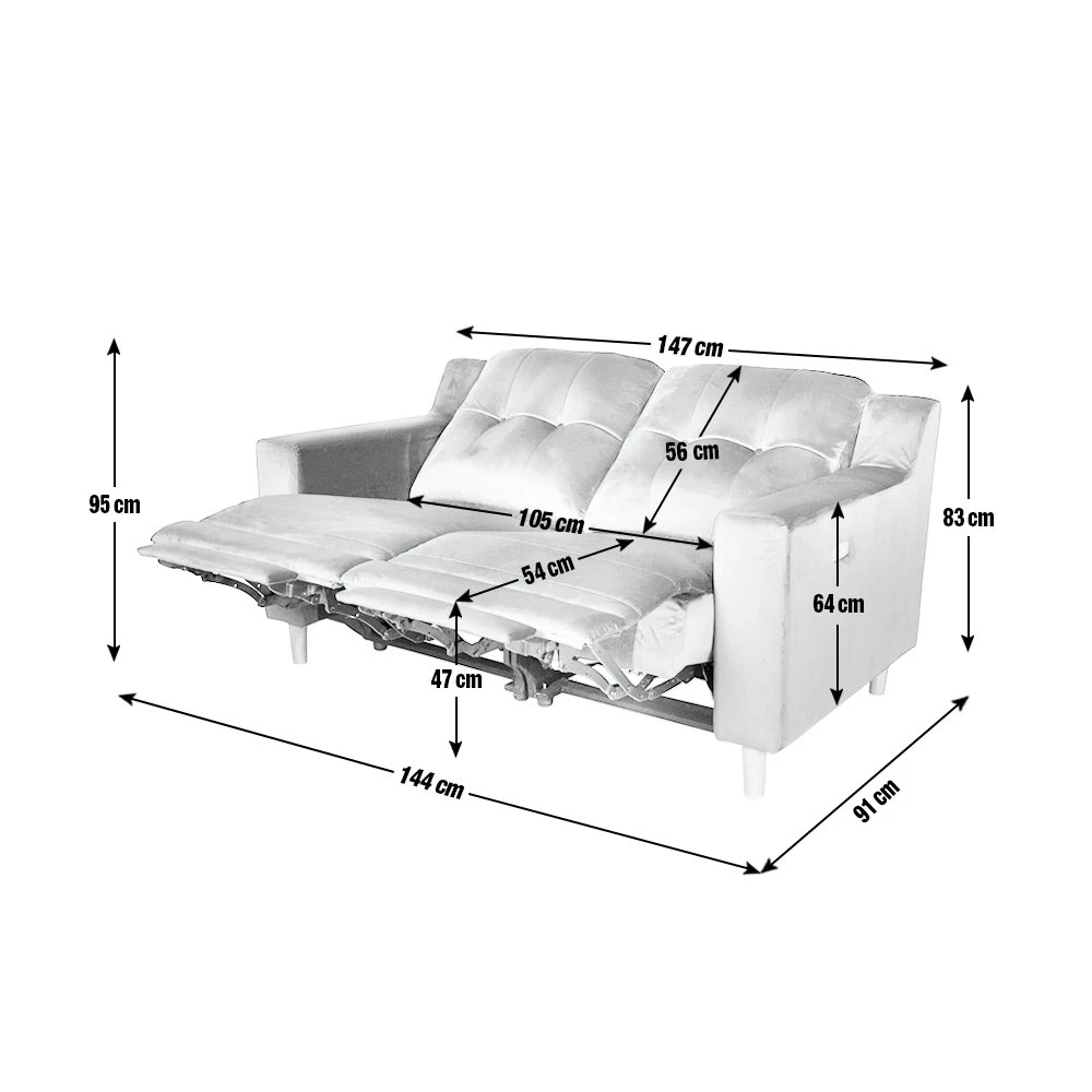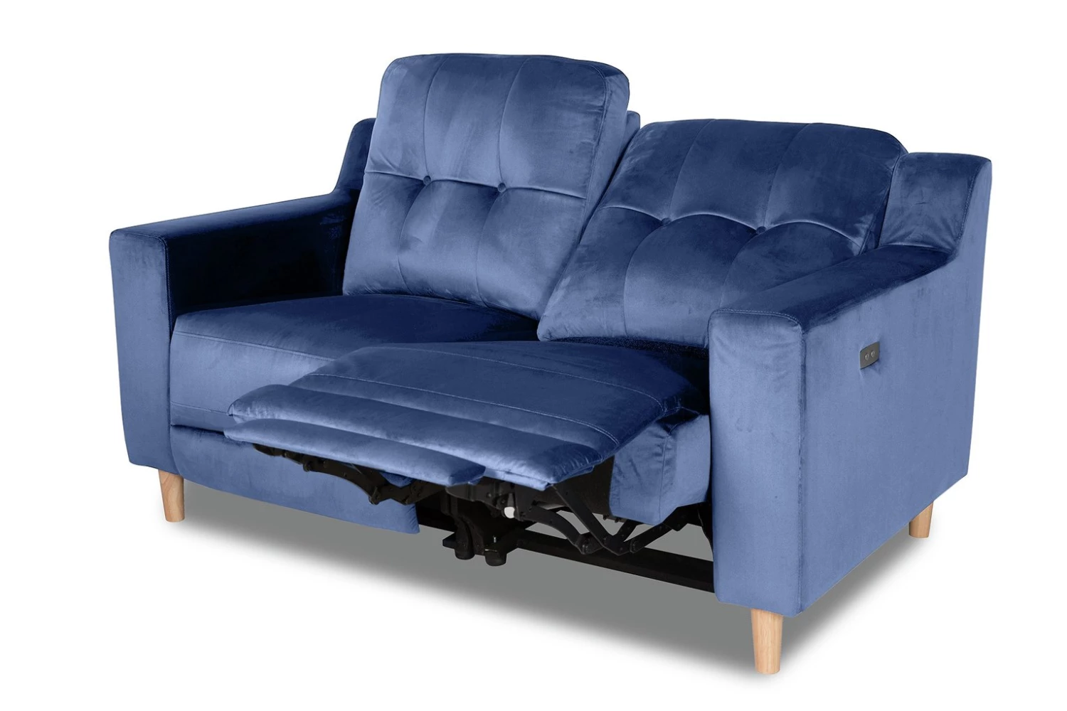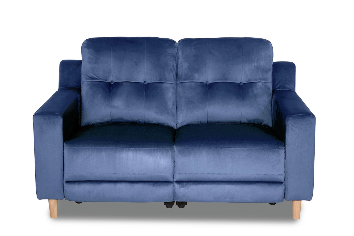 Deeply deliciously deco. We just love the sophisticated, inviting feel to this velvet 2-seater reclining sofa. The sultry petrol blue makes a real statement and at 144cm wide, there's plenty of space for 2 to sink into the plump comfy cushions and powered reclining seats. Total velvety bliss. Tapered wooden legs and paired-down design give an airy, modern twist to the art deco inspired design. Refined relaxation at its best.