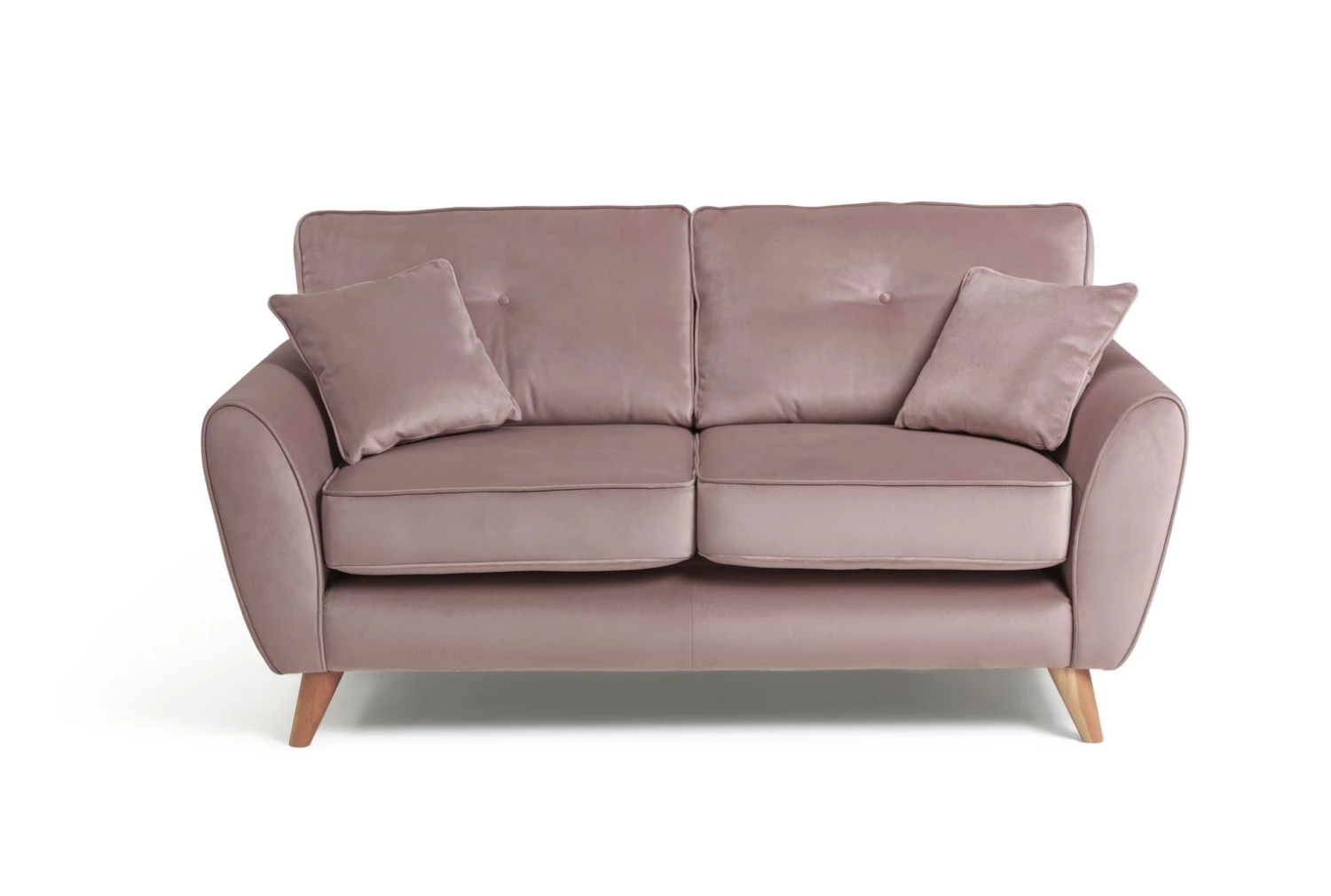 Elegant and snuggly soft, that's Isla. Our irresistible 2-seater sofa is designed with mid-century modern comfort in mind. Just look at those clean curves and traditional button details. Retro, right? While tapered, slim wooden legs lend a contemporary edge. Upholstered in 100% velvet, its smooth texture and beautiful blush pink tones bring a luxe, romantic touch your living room. A sofa that feels just as good as it looks.