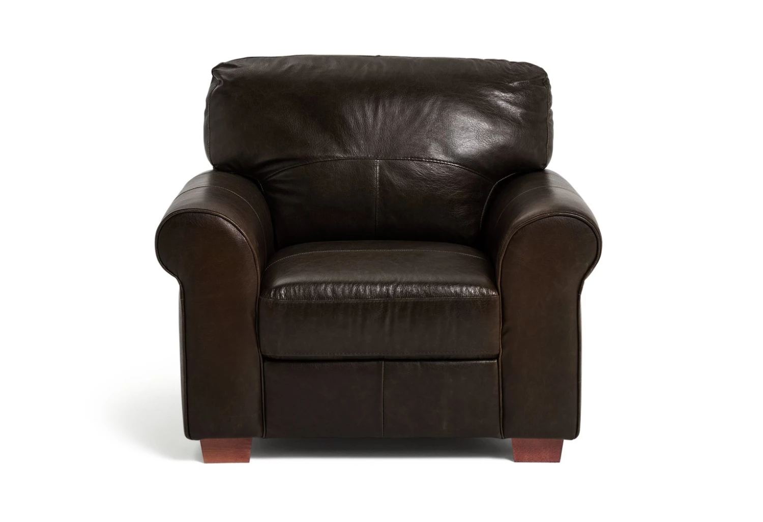 Strong and sophisticated form. The Habitat Salisbury is beautifully crafted using top quality Italian semi aniline leather. It has a subtle creasing, to give this armchair a timeless distressed finish. Its beautiful scroll arms offer a classical touch. We love the look of the wide wooden feet, that raise the chair from the ground. A chic choice.