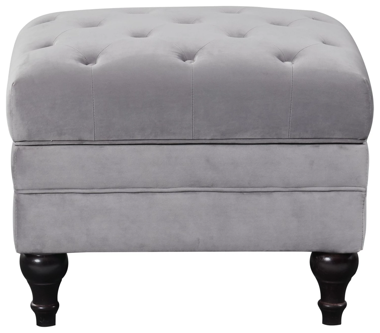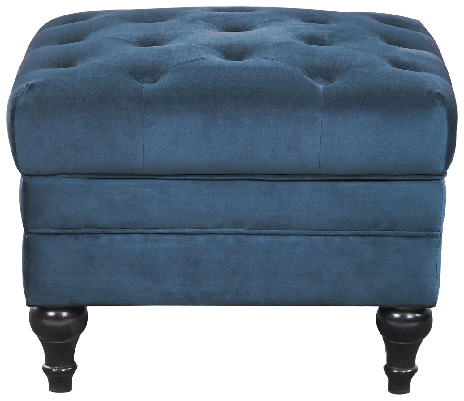 Put your feet up and unwind with this iconic ottoman. Spot those classic Chesterfield details like the deep button tufting and shapely turned wooden legs. The piped edges and rich blue velvet upholstery add to its luxurious style. And with clever concealed storage it's the perfect addition to your lounge or bedroom. Prepare to relax.