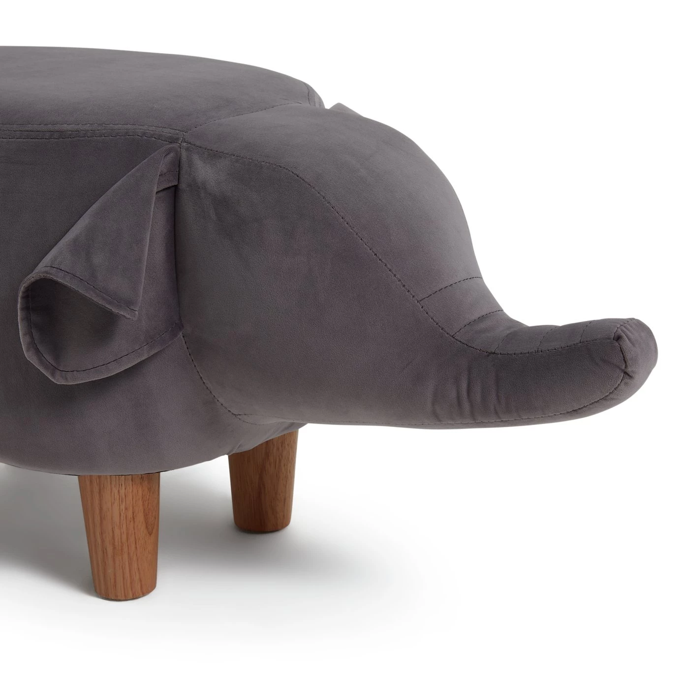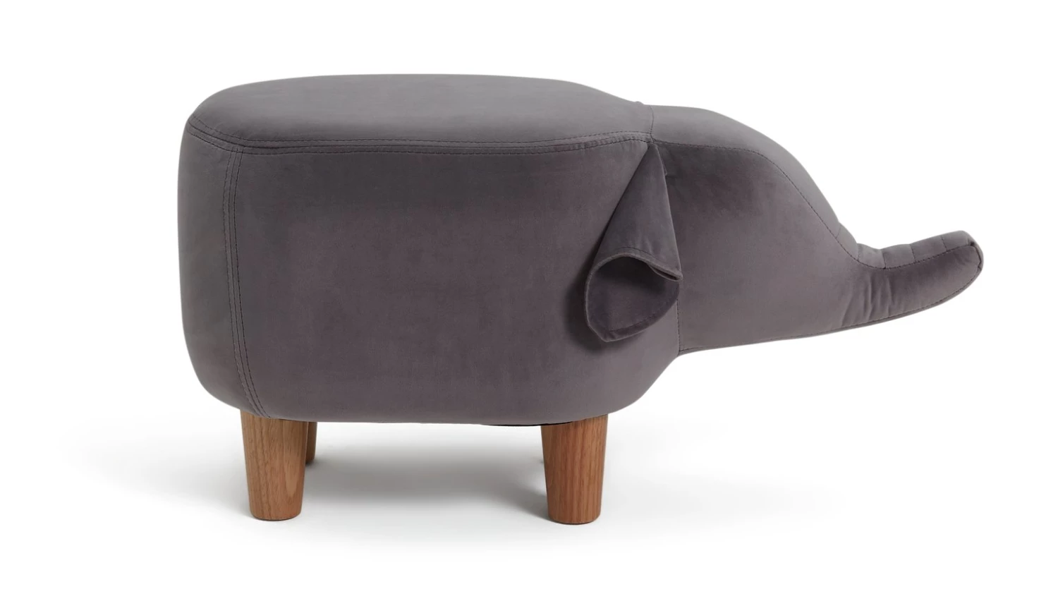 Elton the elephant has come to play! The perfect pal for playtime or for sitting on when it's time for putting on shoes, this fun little elephant stool makes a great accessory for any kid's bedroom or playroom. Soft and cushioned for a cuddly feel, it's covered in sumptuously touchable grey velvet and features chunky wooden legs.