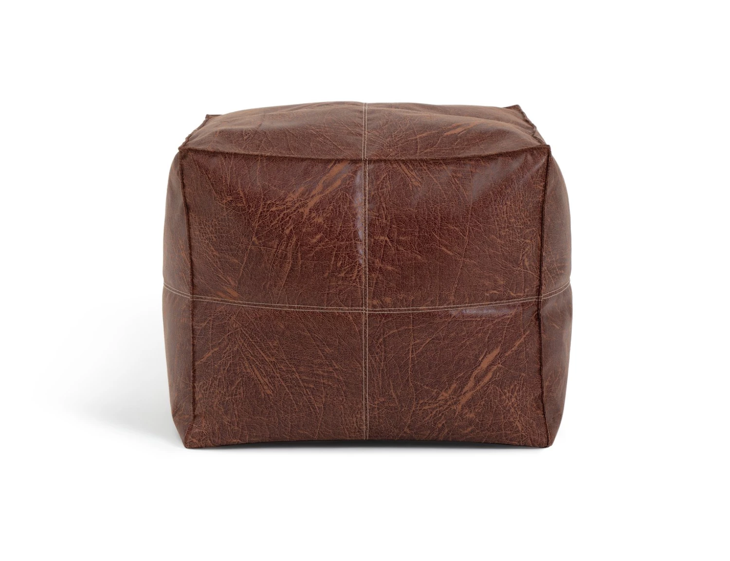 Eco-luxury for foot weary warriors. Rest your feet or take a seat on this fab distressed faux leather pouffe. Luxurious, stylish and practical, this fabric has it all. Each panel is neatly cut and the sewn edges left exposed. So on trend. The Eco-leather has been recycled and redyed. And the PU finish makes keeping it clean is a doddle. It's old word grandeur in modern world style.
