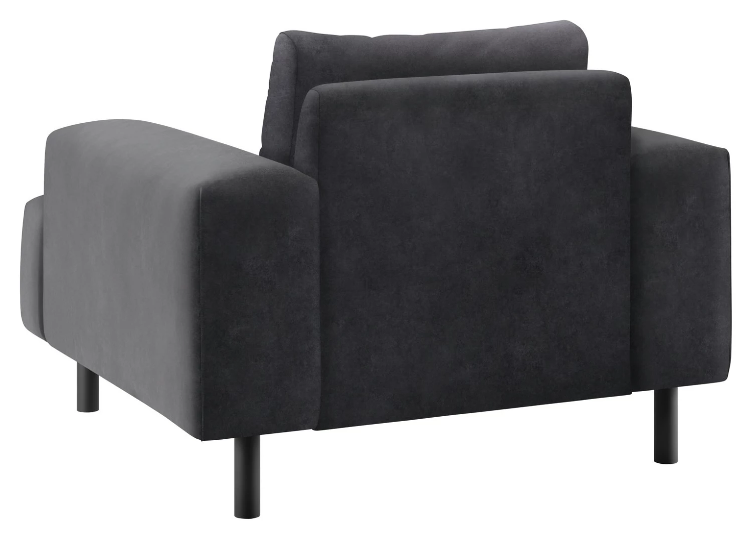 With its boxy, masculine shape, generous proportions and wide arms, the Julian charcoal velvet armchair sofa is a handsome, confident design. The sociable sofa has t-shaped seat cushions with a smooth wrapped front filled with foam for a firm sit and pillow-like, foam back cushions.