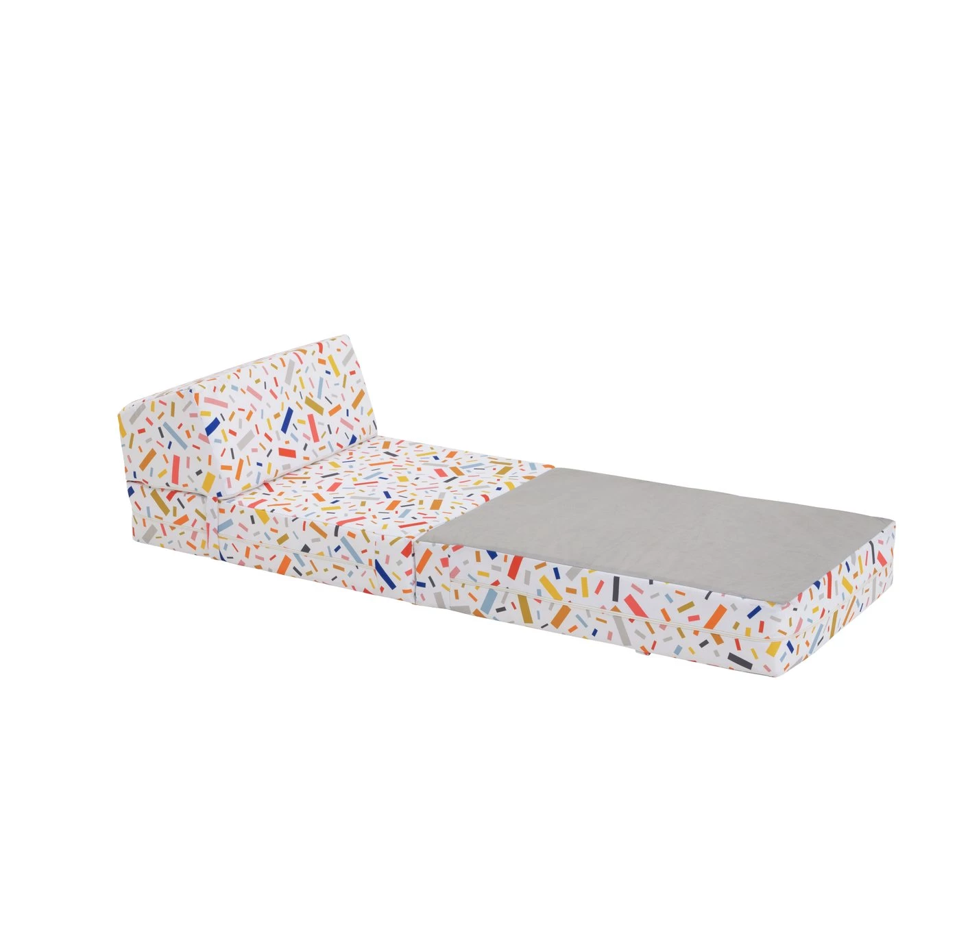 Say yes to sleepovers. Our confetti-covered folding chair bed doubles up as a comfy seat in the day and a cosy mattress for guests at night. The slanted back on the chair is made for relaxing. Quick and easy to transform too. Handy ties on each side means it's ready for bed in a flash. Filled with thick and bouncy foam, it's a dream to sleep on. Mucky pups? The polyester coating just needs a quick wipe. Sorted.