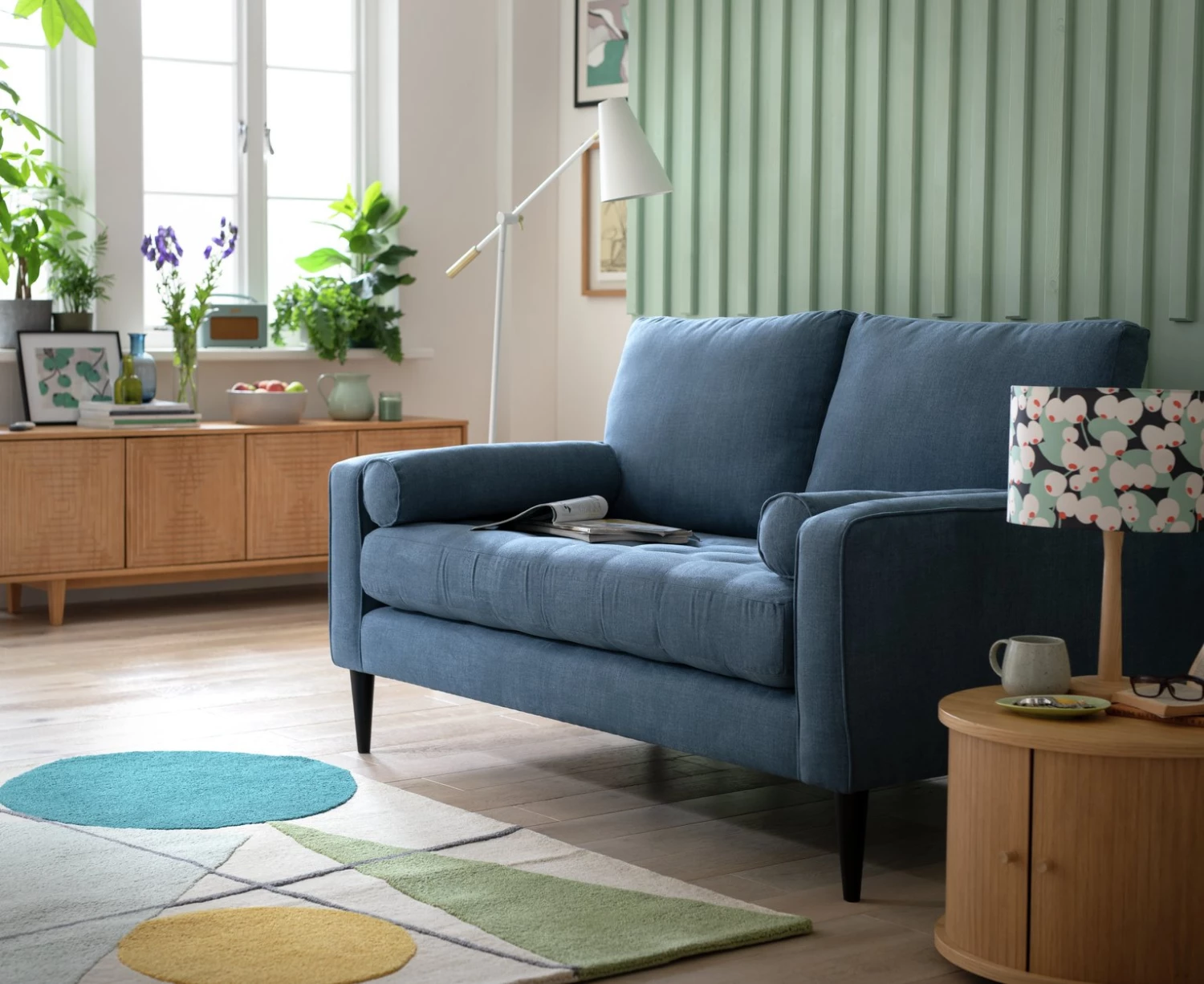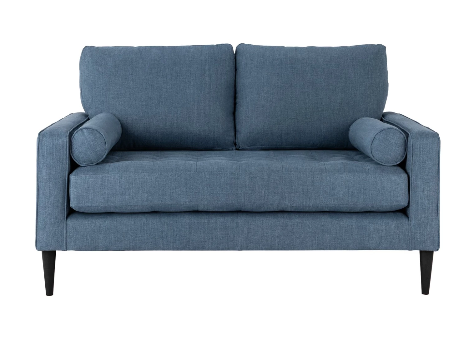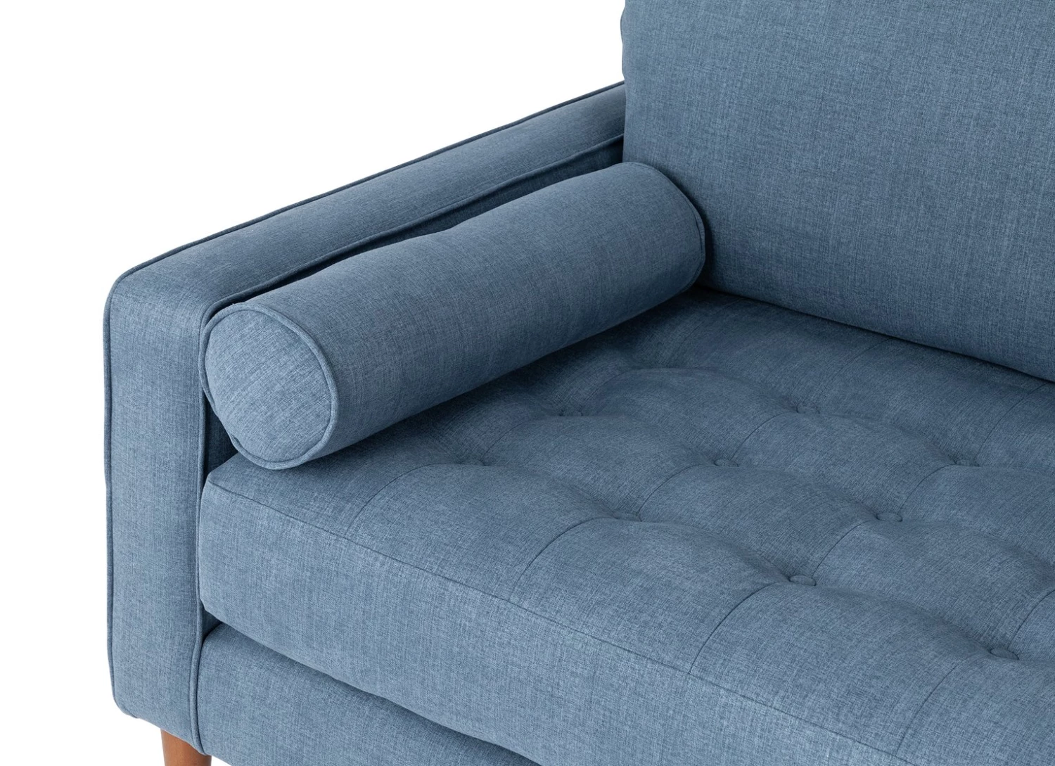 Buttons, bolsters, British. That's our Hudson. This fab 2-seater has a wonderful linnet tone that will create a soothing setting. Its soft-to-touch fabric wows. One of a kind, Hudson is characterised by its buttoned seat and striking bolster cushions. It has a stand-out style that just works. Hudson is raised up on slender wooden feet to give it an elegant edge. Best of British, its manufactured right here in the UK. Bolster up.