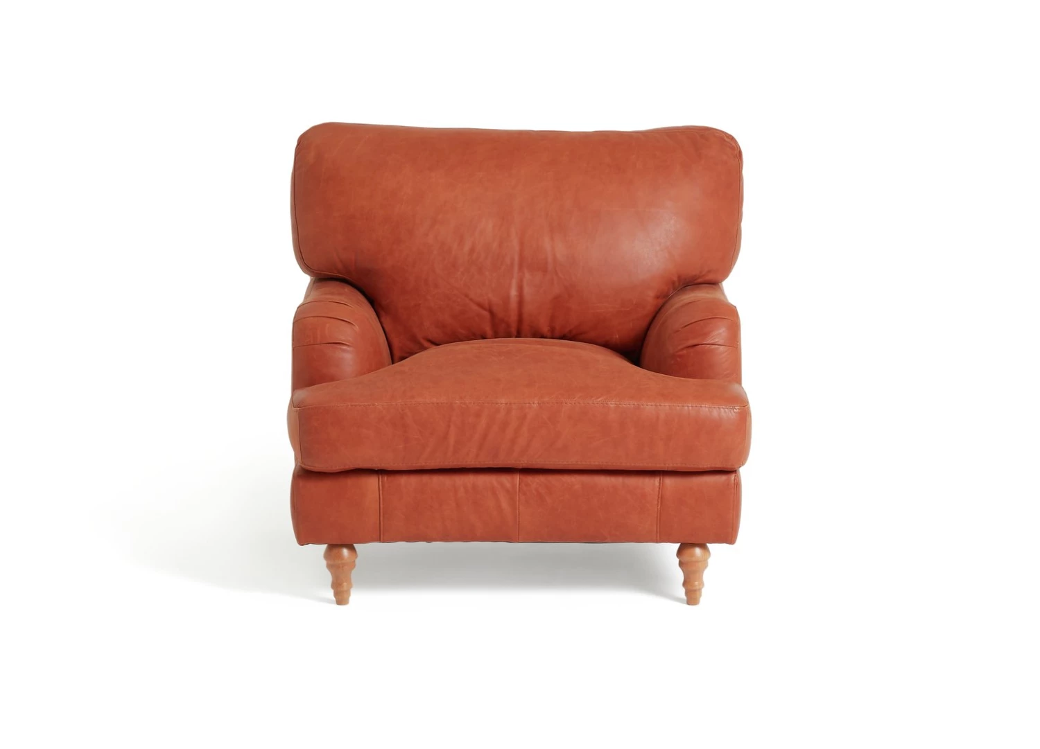 Curl up in style. The Habitat Livingston armchair is set on intricate solid wood feet. It is finished in full aniline leather, so the natural, inherent grain and markings shine through. Strikingly rustic.