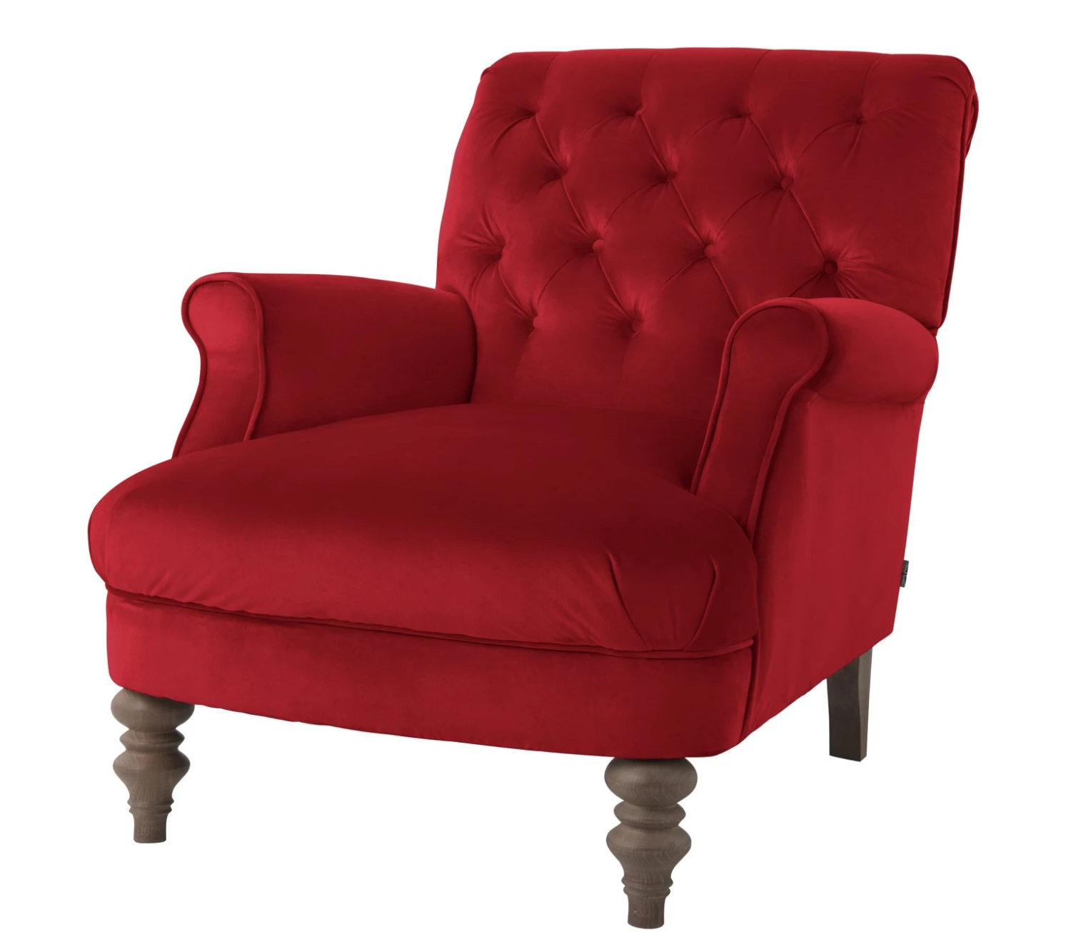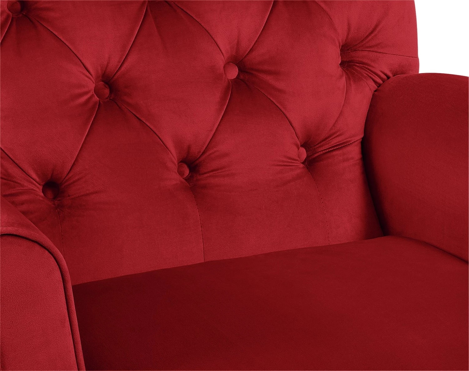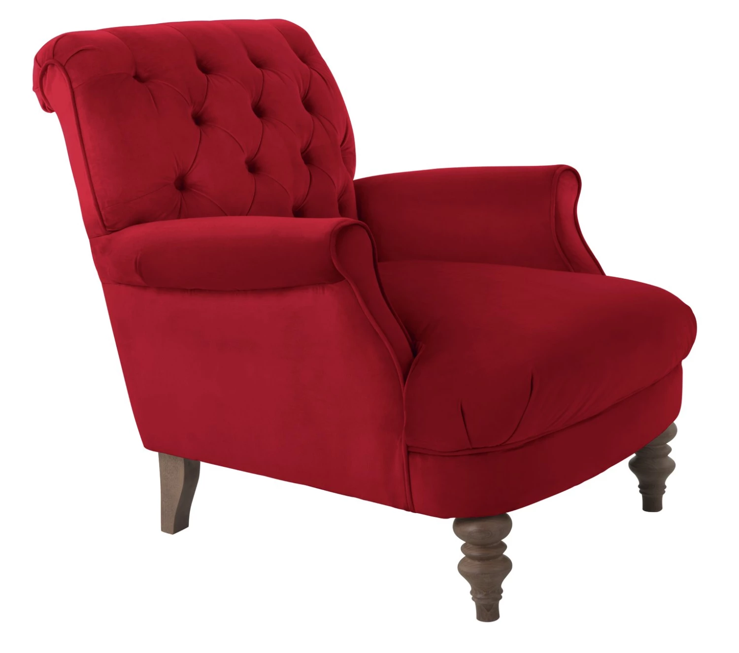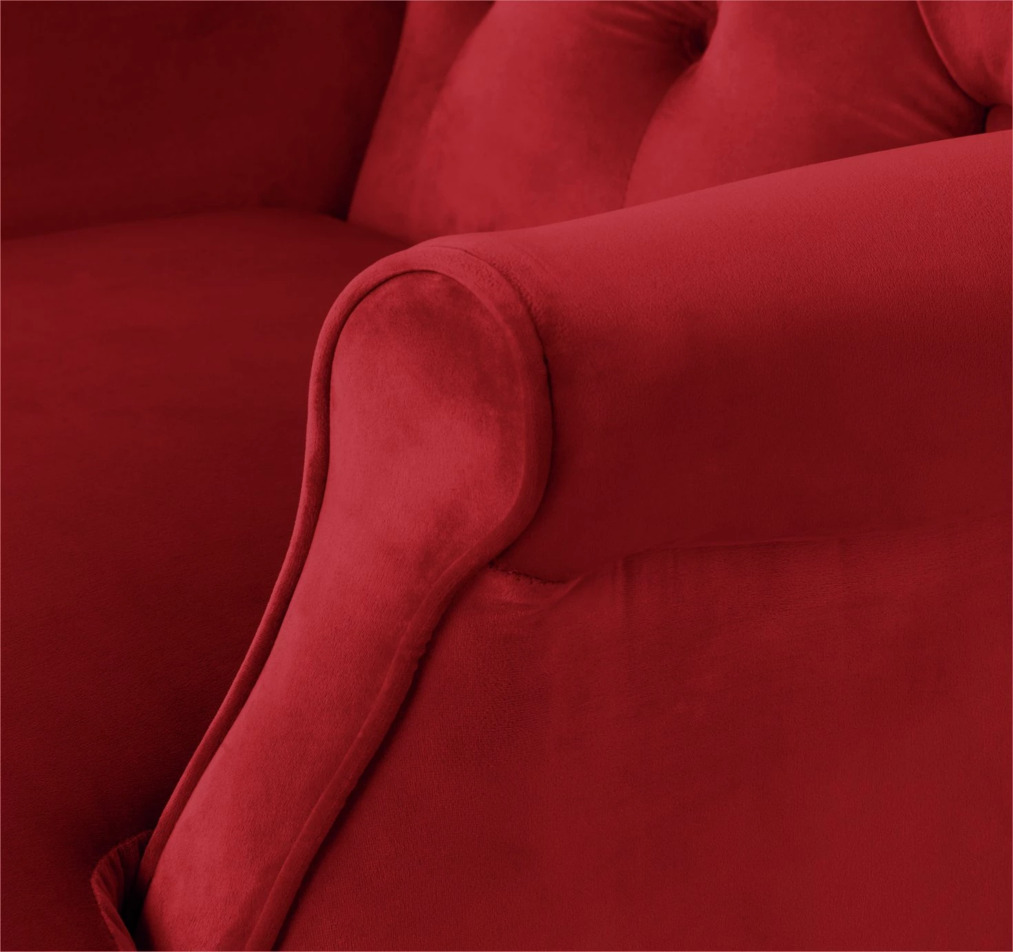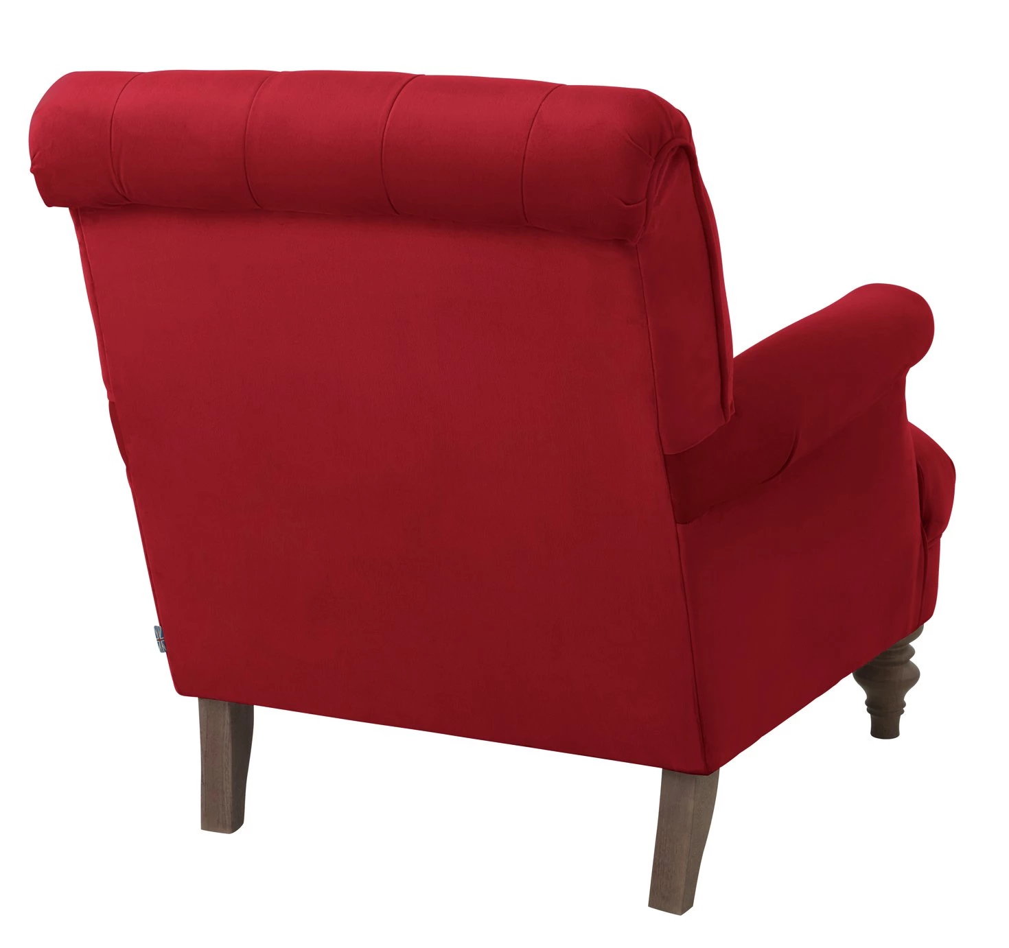 Valerie is one debonair chair. Our classic Chesterfield-style seat in bright red velvet makes a radiant addition to your lounge. Sink into a luxuriously comfy foam filled seat pad and supportive buttoned backrest after a long day. Ah, that's good. Handsome scroll arms and turned wooden feet take its elegance to new heights. Snuggling up with a good book or settling in for movie night? It's a charming place to chill.