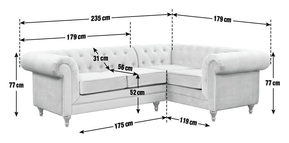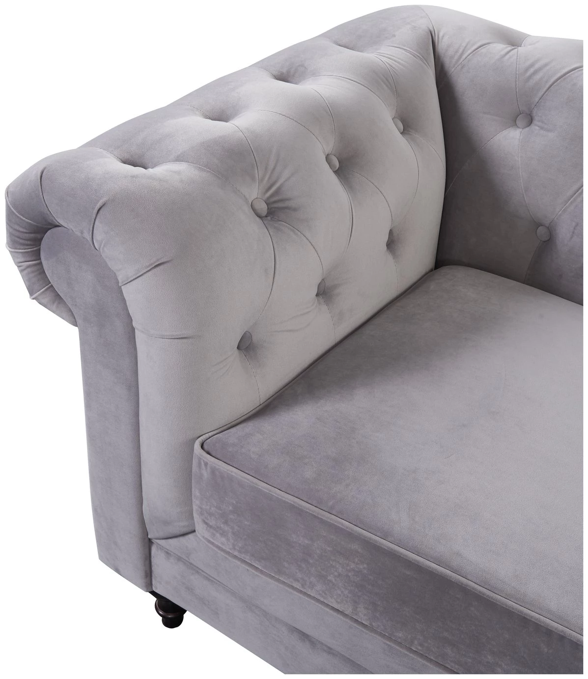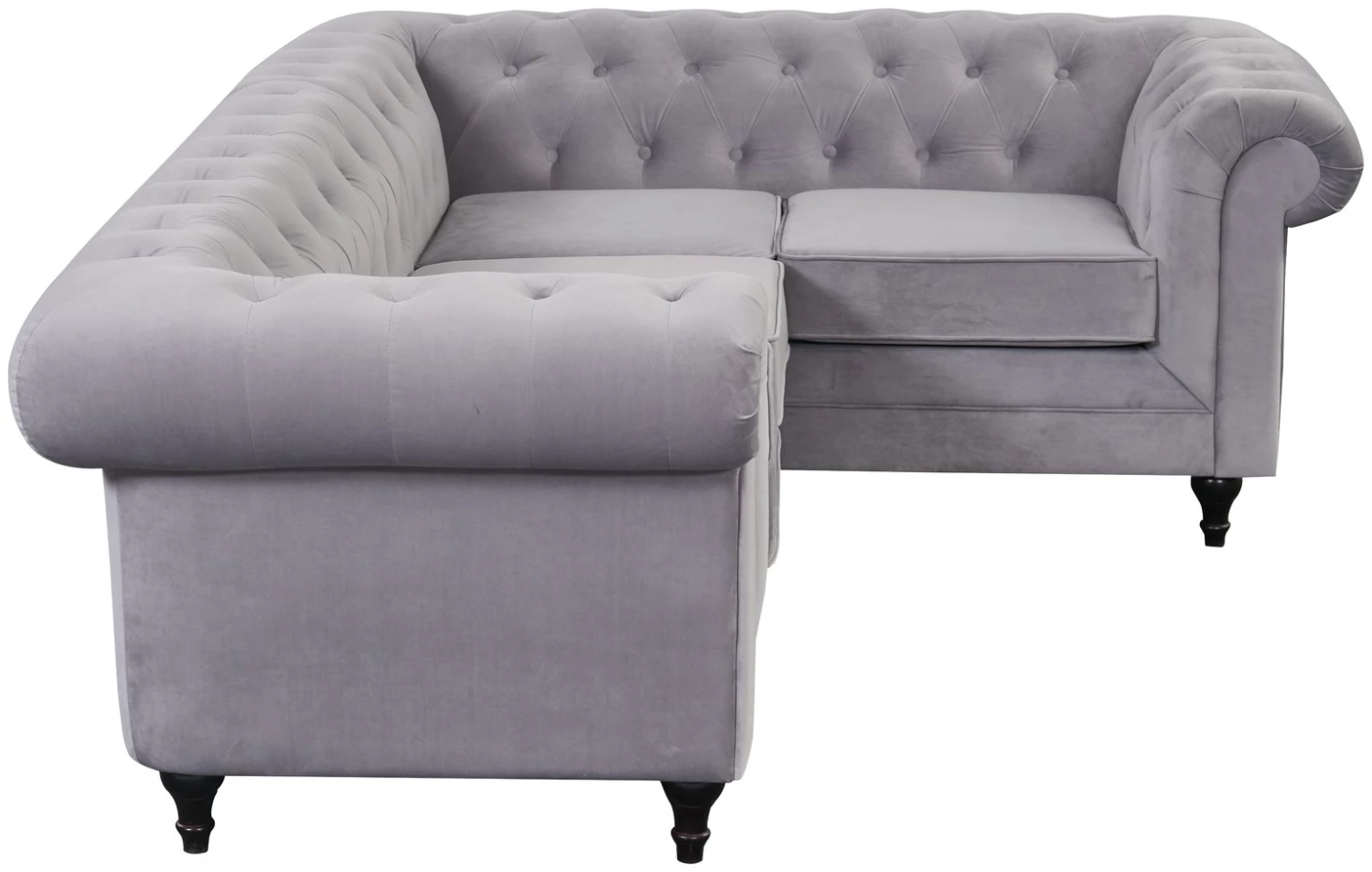 Timelessly tasteful. Beautifully upholstered in luxurious grey velvet, our Chesterfield left corner sofa is full of classic character. It has everything you'd expect from an iconic design. Sumptuous deep buttoning, scroll arms and turned wooden feet. Plump pocket-sprung cushions and piped edges add to its quality credentials. And it comes with modern corner hugging convenience. How good is that?