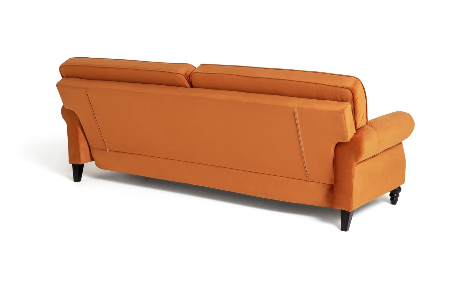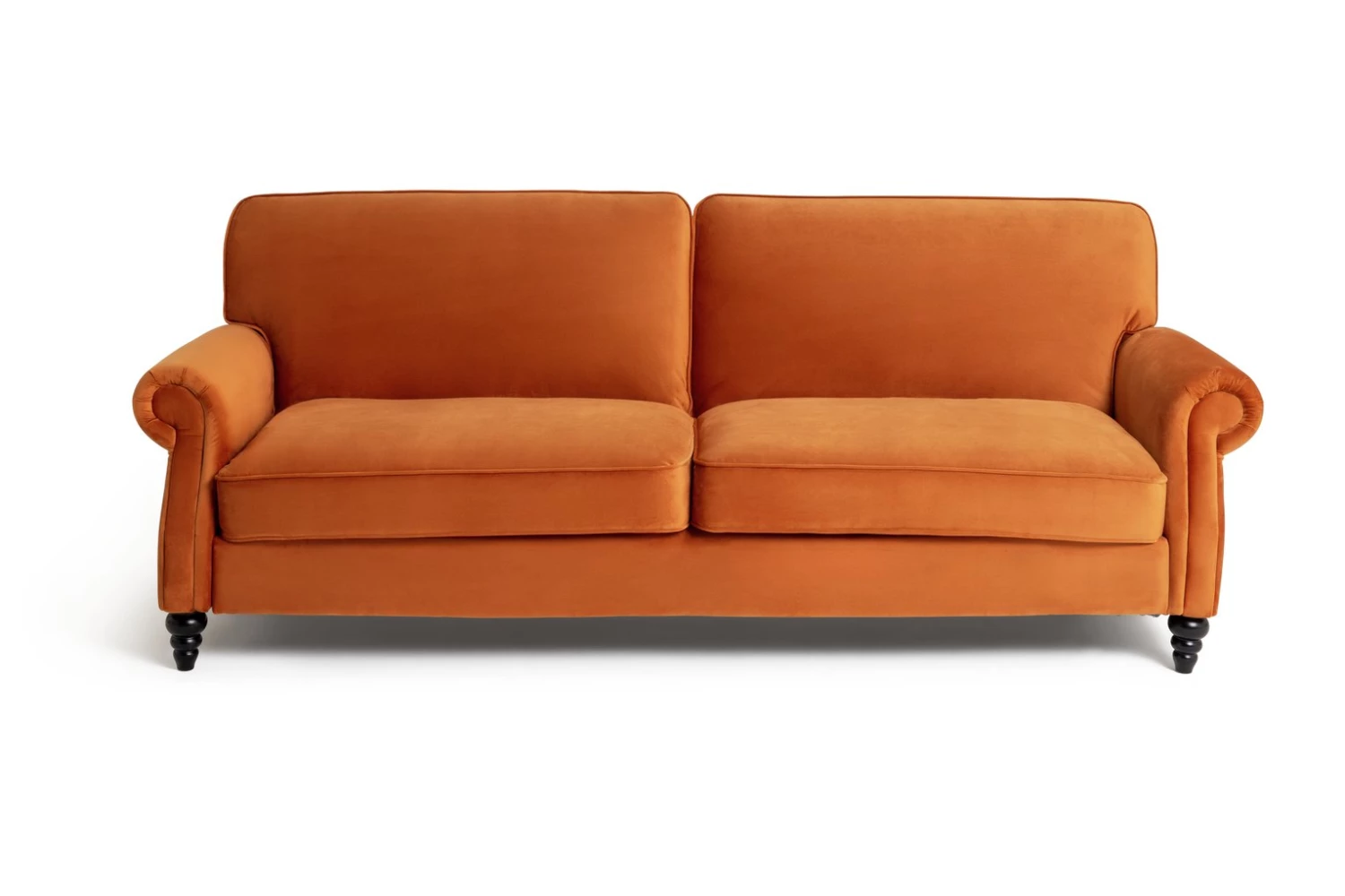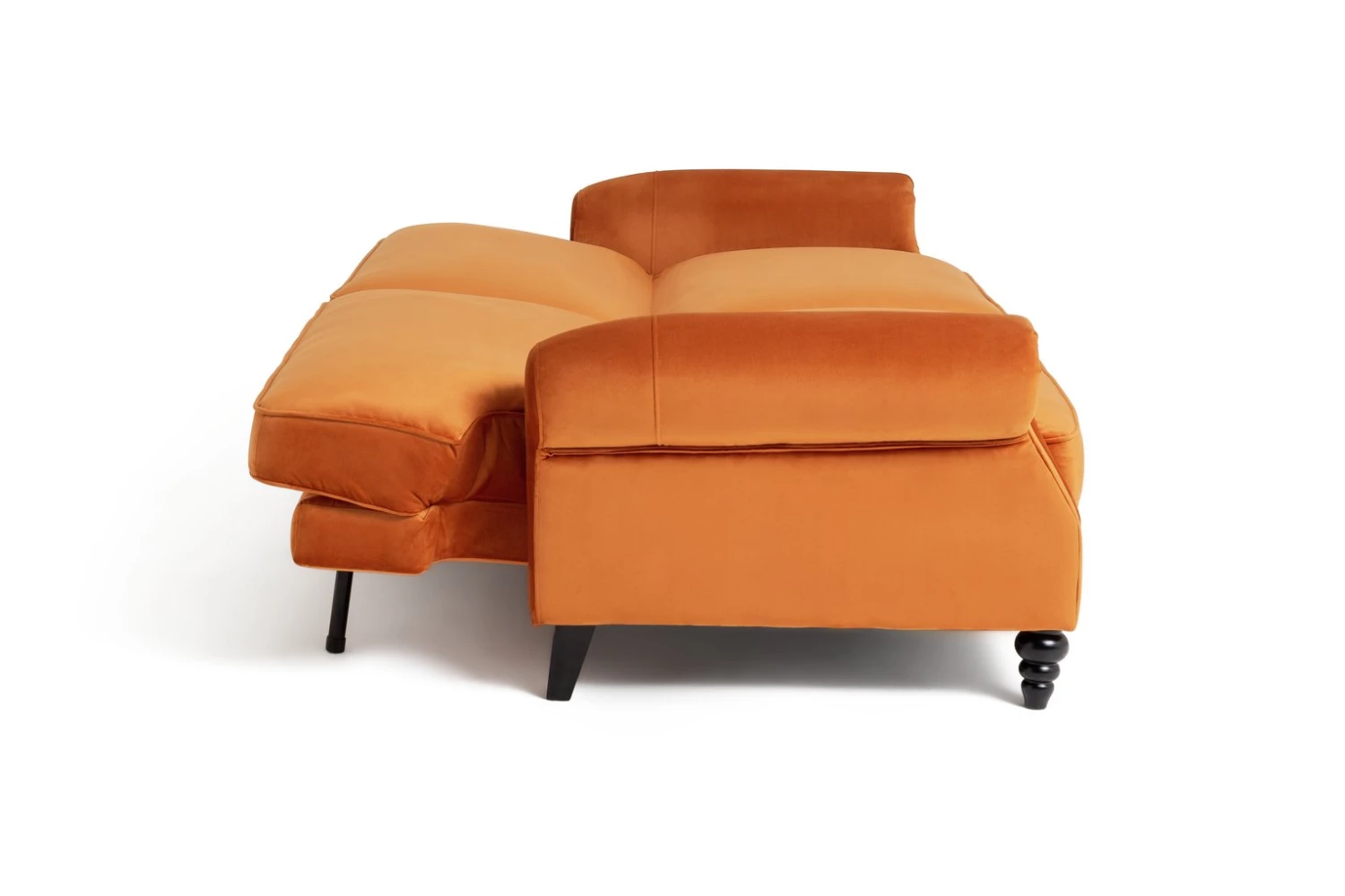 From sofa to bed in seconds. This vibrant orange sofa adds real wow to your living room. A smart place to sit during the day, then hey presto a comfy bed at night. Fab if a visitor needs to sleepover or friends needs a place to crash. Plump cushions and fine upholstery mean it's super soft and welcoming. And the sleek lines and dark wood legs add a contemporary touch too. The simple clic clac mechanism helps the transformation from daytime seat to night-time rest effortless. Just add a duvet and some pillows. A fab and functional choice.