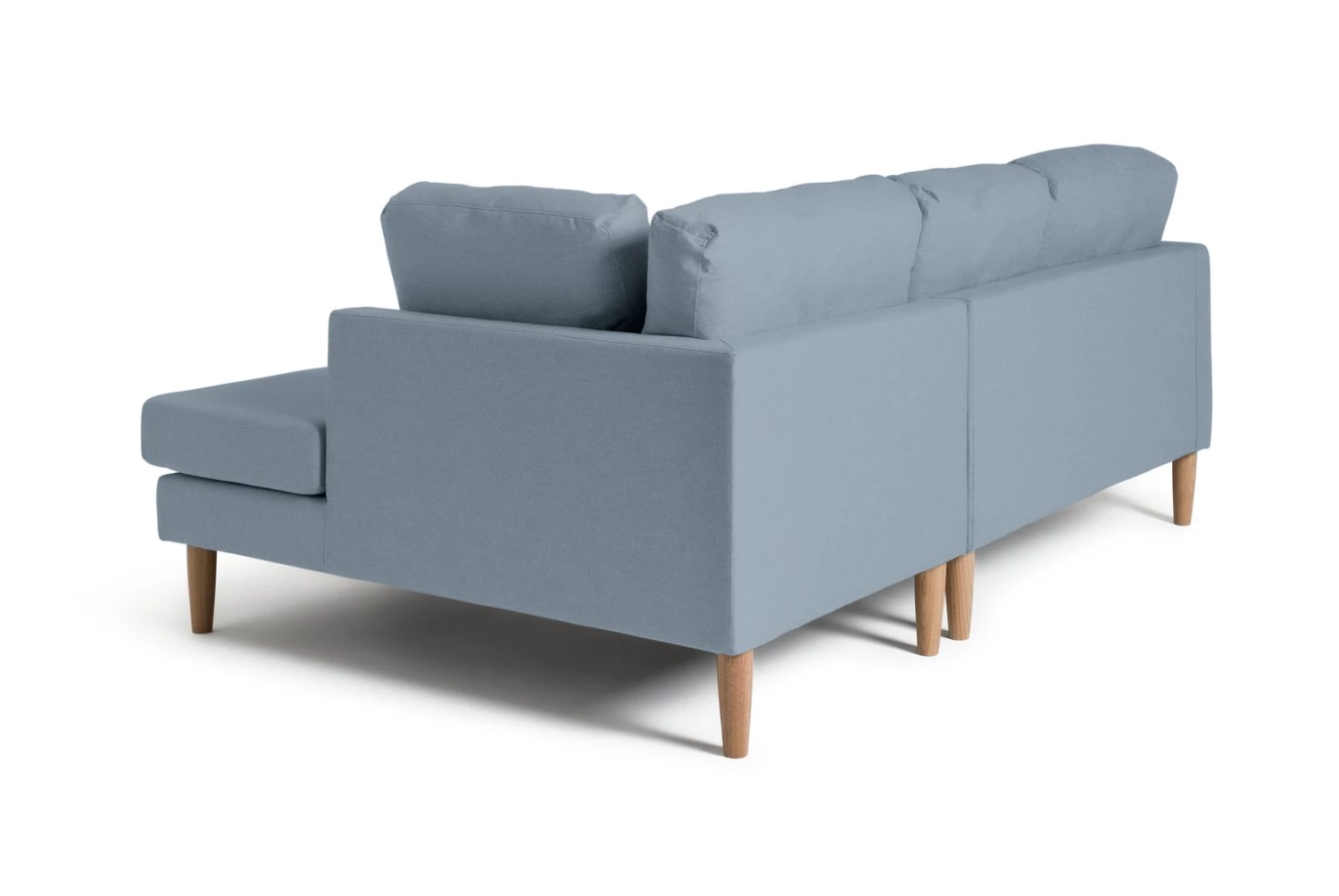 Sit. Stretch. Snuggle. Made for contemporary living this spacious corner sofa is very accommodating. The bold blue fabric, angled lines and tapered light wood legs accentuate its modern simplicity. And it's as comfortable as it looks. Pocket sprung foam filled seat cushions are soft and supportive. The plump, button detailing back cushions are made for relaxing into. Kit out your corner and kick back.