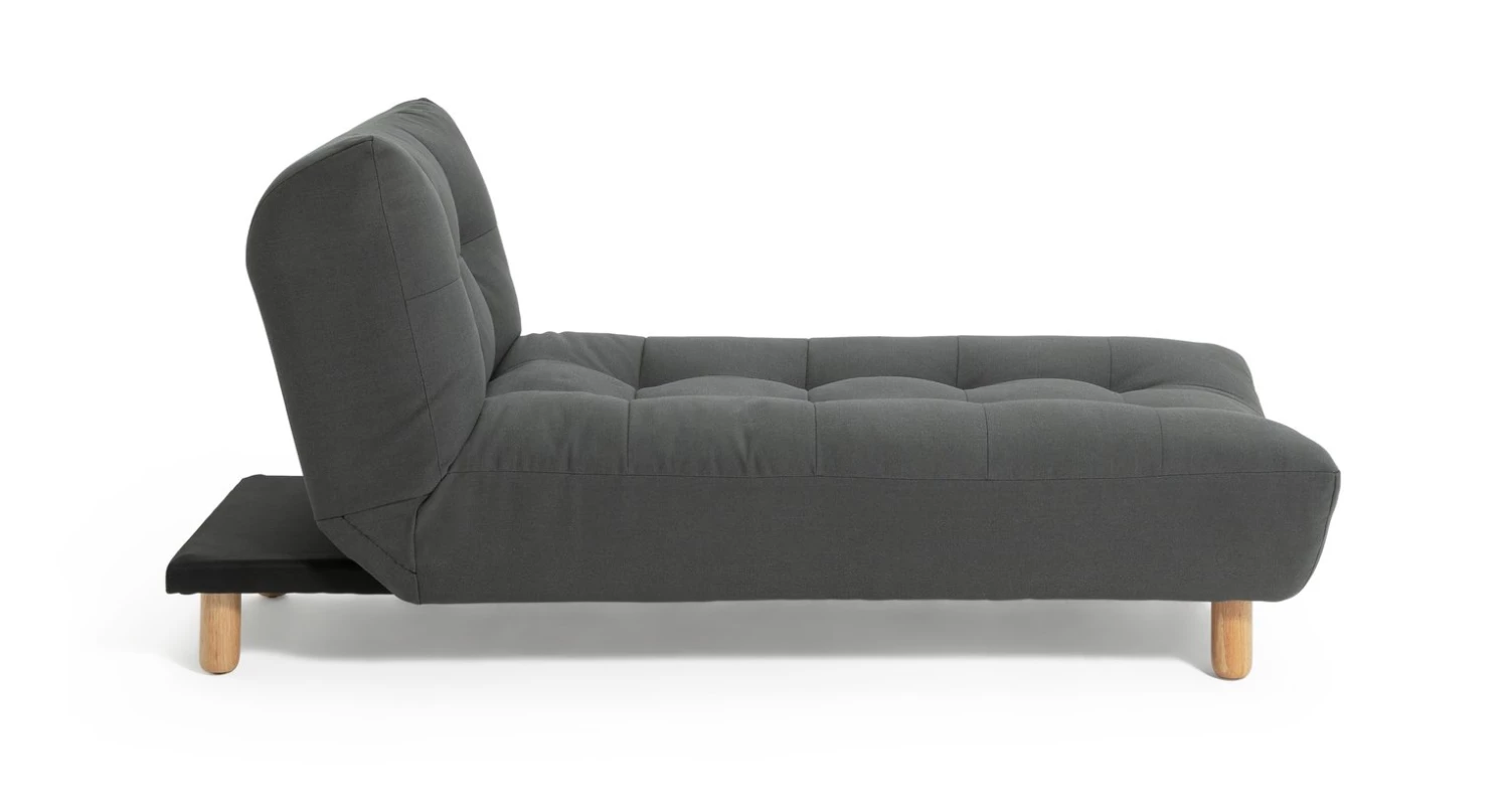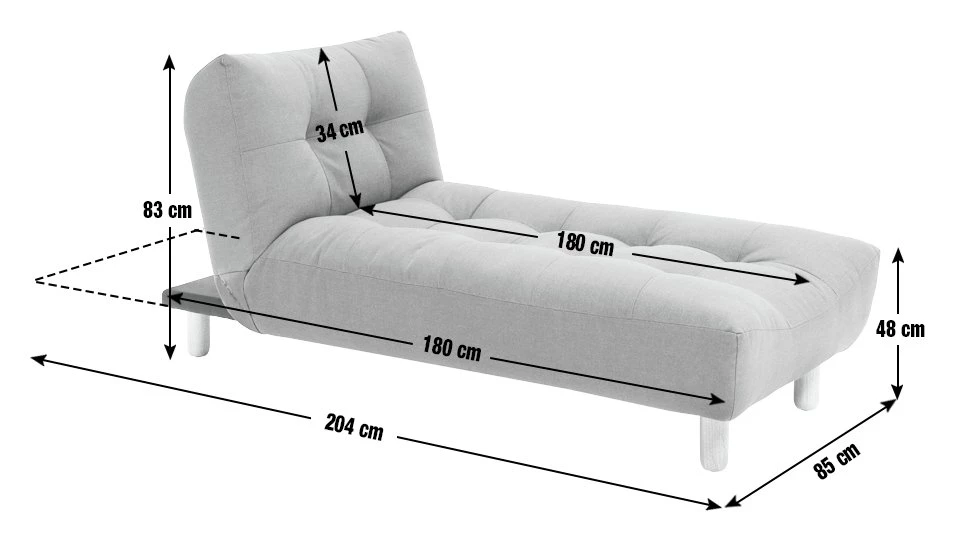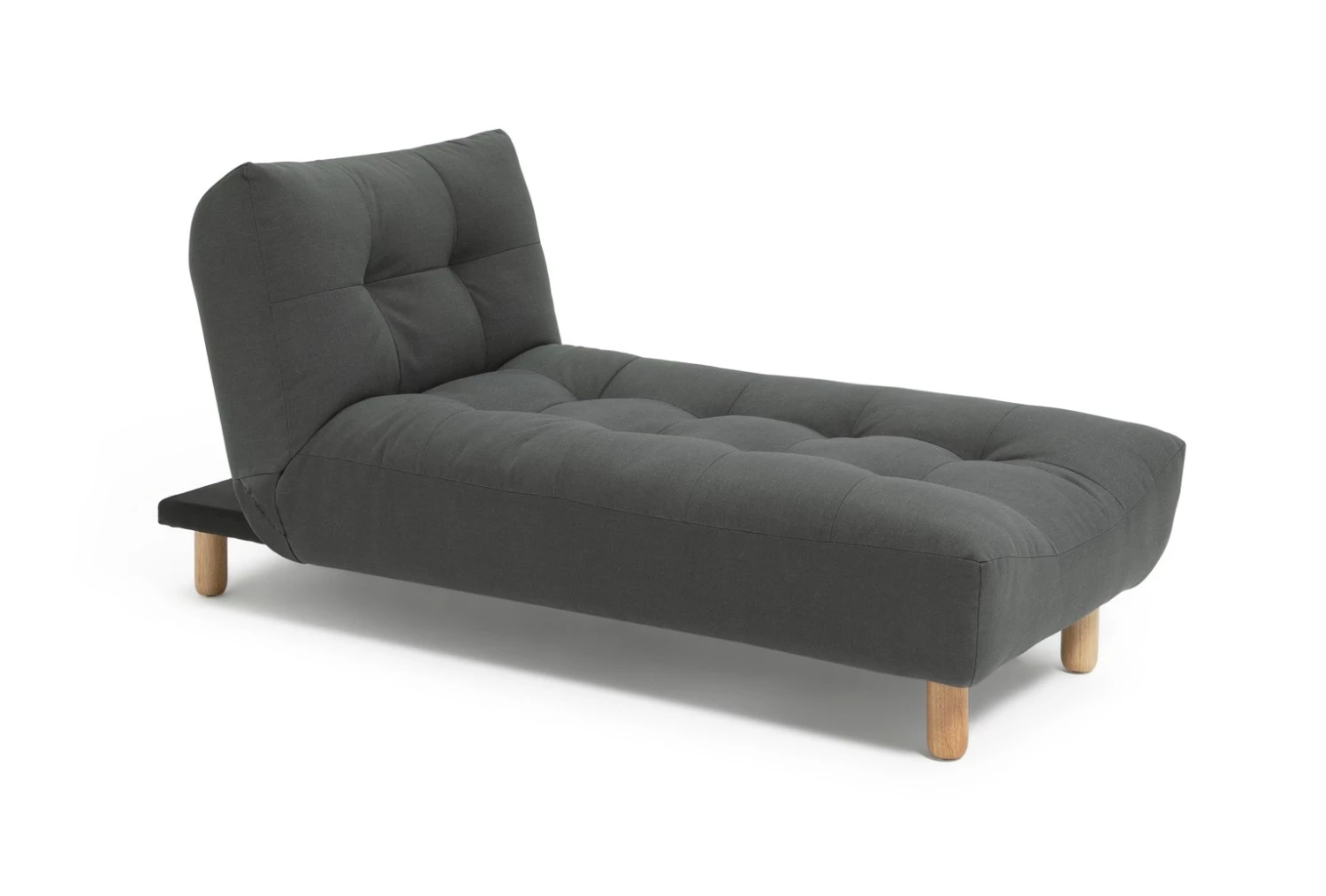 Laze in luxury. Our grey chaise sofa is made for relaxing in the lounge or bedroom. Upholstered in 100% fabric, it's decadently soft to touch. The dimpled curves, tufting detail and rounded wooden feet give it a real contemporary feel. And the foam filling is uber inviting. Raise the reclining end to chill in comfort or lower it and stretch out for a nap. Makes a handy bed for unexpected guests too. Get ready for a laid-back day kind of day.