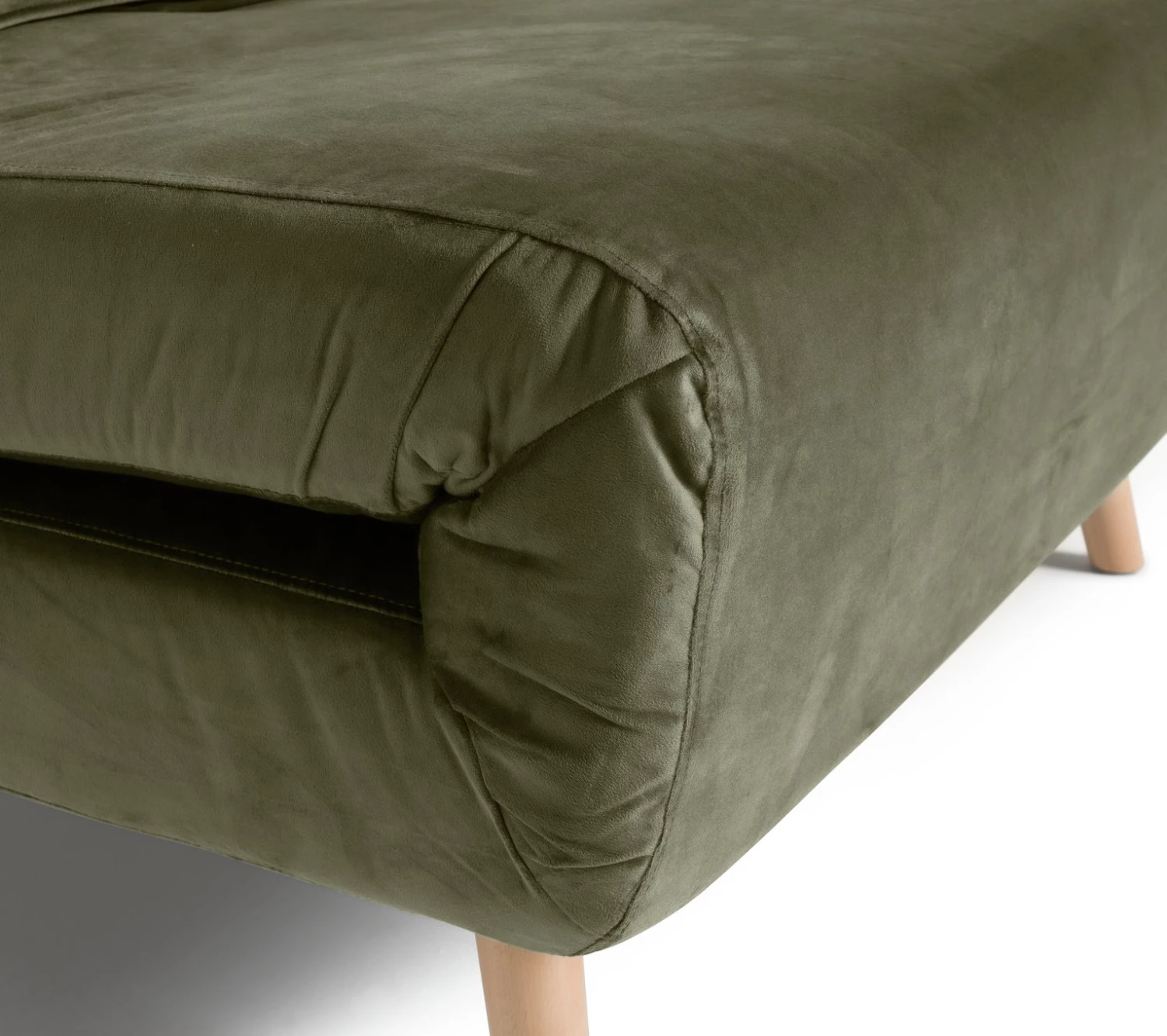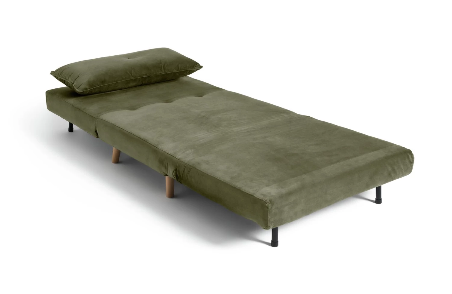 A spare bed for one? It's Roma to the rescue. In smooth sage our modern chair bed is a smart way to be prepared. Its day job is being a comfy chair. If it's on the night shift, it transforms into a comfy single bed. Clever. Either way the plump stuffed foam cushions are great for relaxing. And the long back cushion with single button detail adds to its contemporary style. Arrives complete, simply pop on the feet.