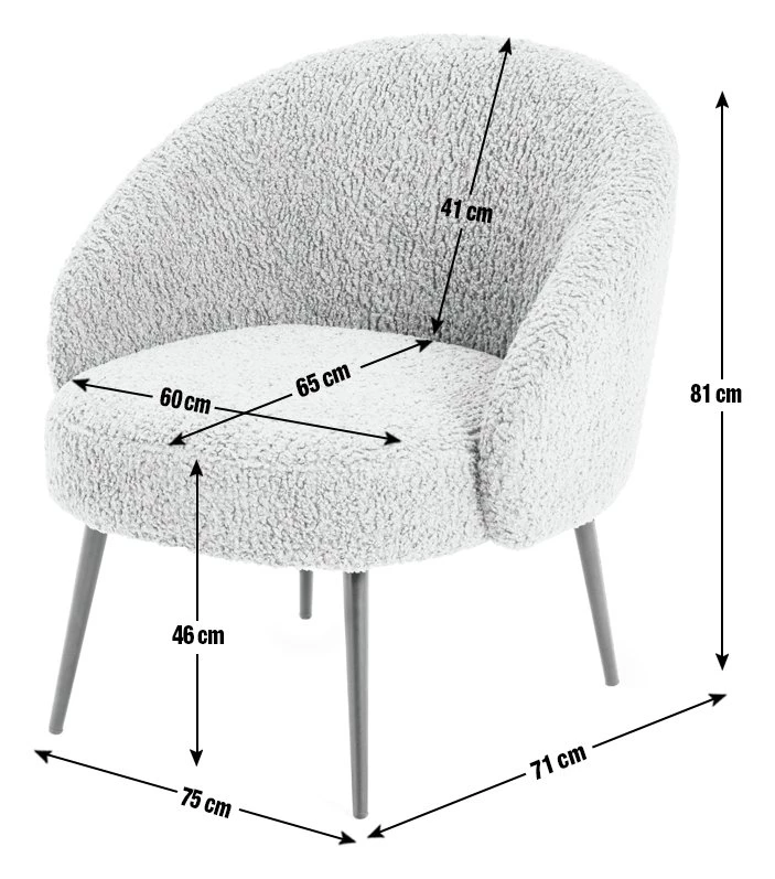 Sink into softness with our cosy, curvaceous chair. Upholstered in 100% cream boucle, it's fluffy and fabulous. A rounded backrest and thick foam-filled cushion surround and support you like a big hug. While slim, tapered metal legs in black powder coating offer a smart, modern edge. Heavenly, cloud-like comfort.
