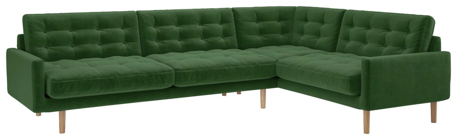 Made in Italy, the Fenner velvet dark blue left-hand 4 seater corner sofa has slender cushioned arms and soft, feather-wrapped fibre seat and back cushions. The sumptuous sofa combines a classic box frame with loose covers for a softer look and has button detailing on its cushions, which acquire a relaxed, comfortably lived-in look over time. Exclusive to Habitat, the sofa's deep seat and thin frame create a large seating area.