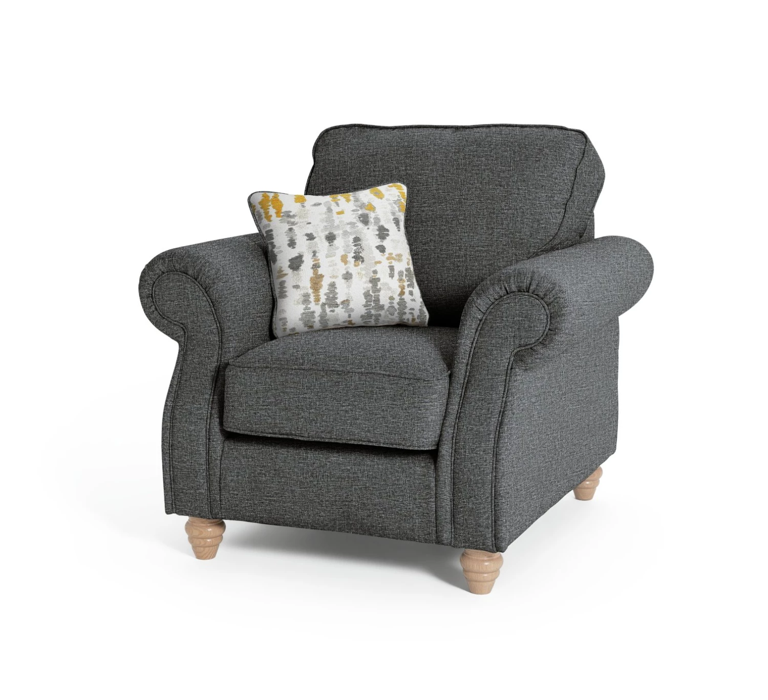 Curl up and settle in. Our dark grey fabric armchair is just the spot to wind down with a book or movie. With deep foam seats and a reversible fibre filled back cushion, it's super comfy. Made in the UK, the traditional design has scroll arms, turned wooden legs and piping detail. A classic choice. Comes with a matching patterned feather filled cushion to complete the look. Cosy corner here you come.