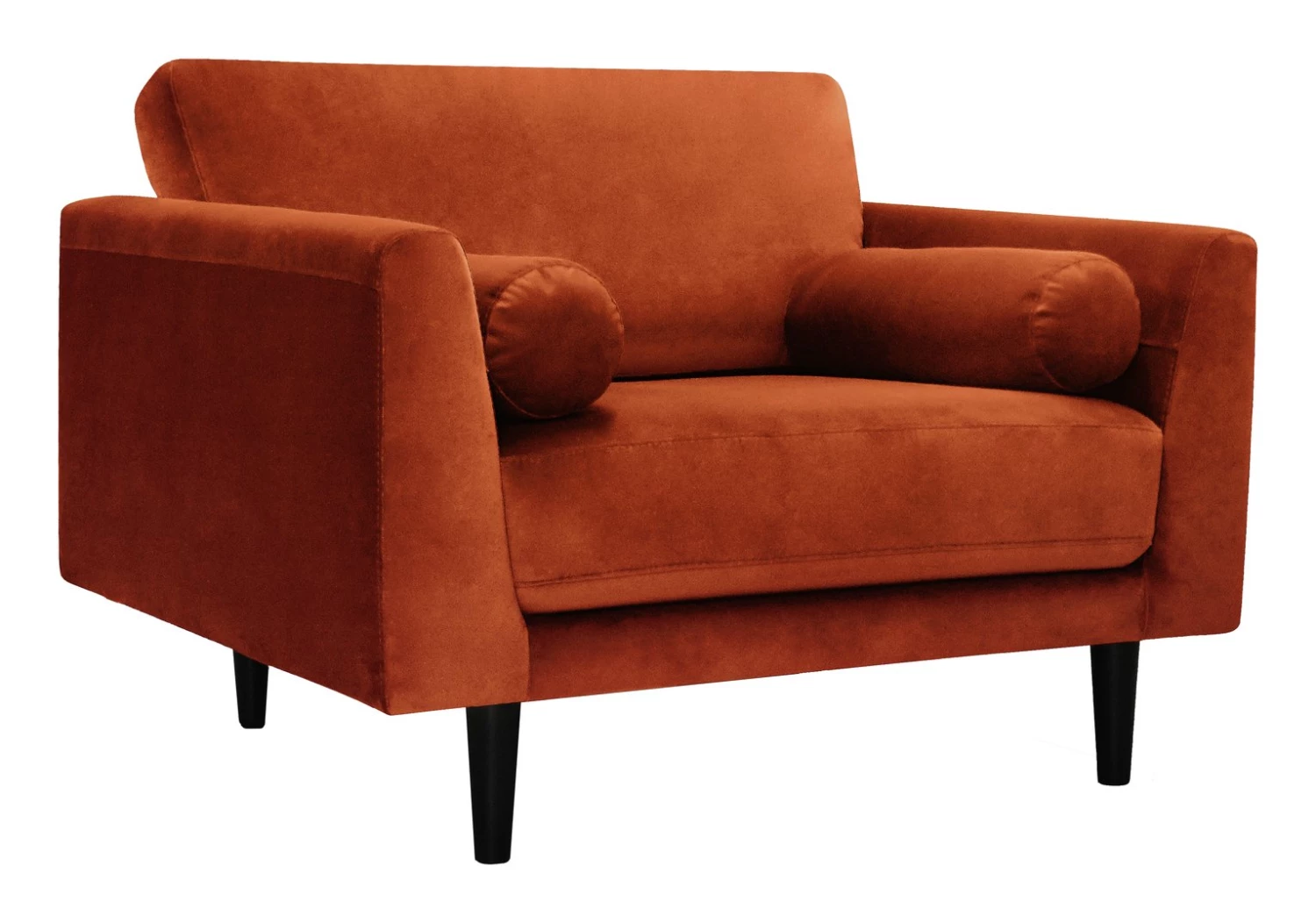 Bolstered to boost your comfort. Our Jackson armchair boasts comfort and elegance in equal measure. Upholstered in opulent burnt orange velvet, a classic colour choice for those with confidence in their style decisions. Complements wooden floors, and homes designed with a distinctly modern decor. The wide seats make it oh so inviting. Sink into the plump foam fibre seats and back for an ultra-soft cushioning experience. The slim tapered arms and turned wooden legs are a subtle nod to mid-century design.