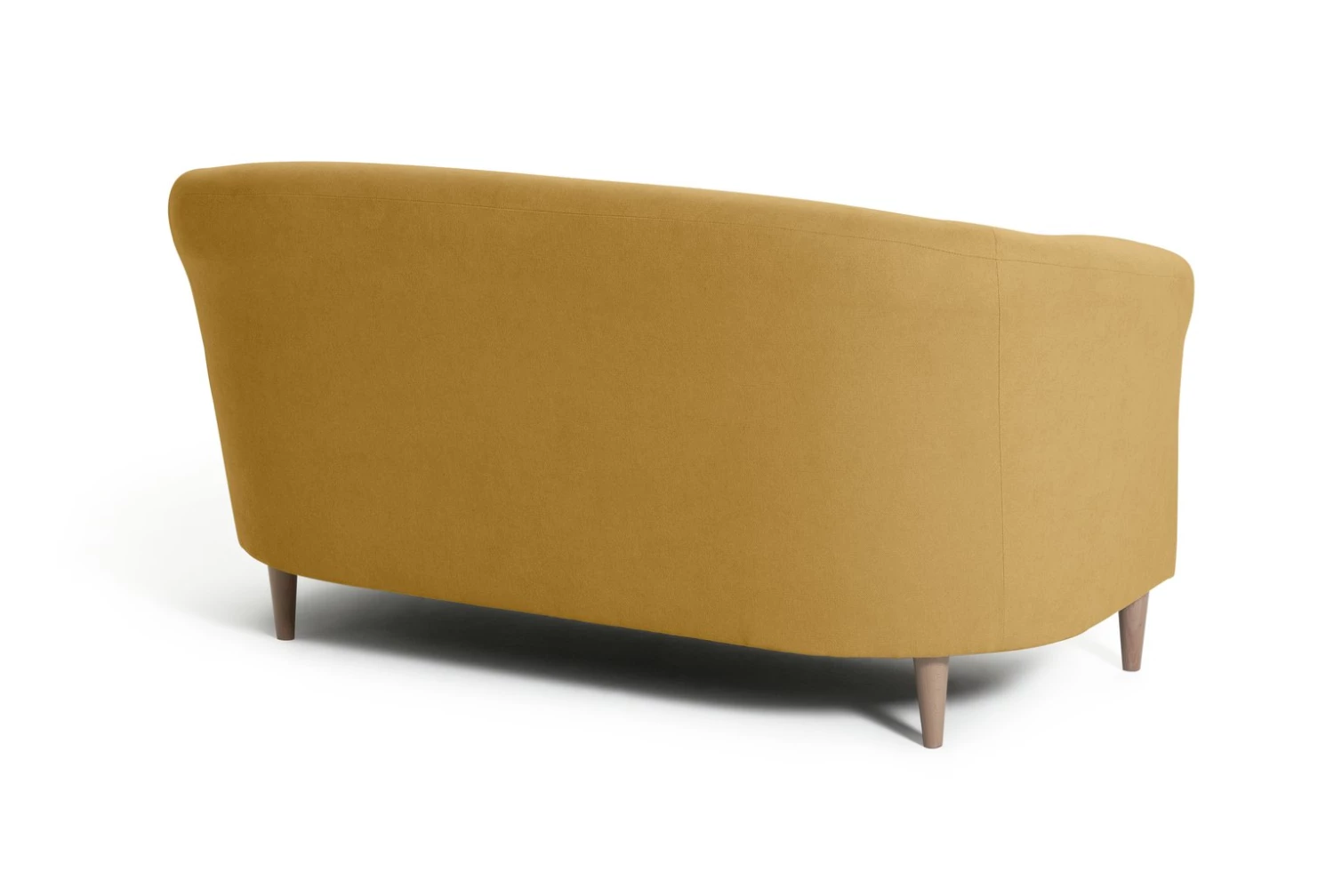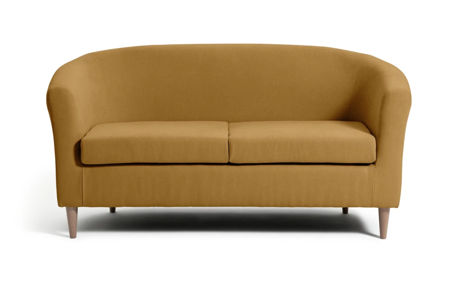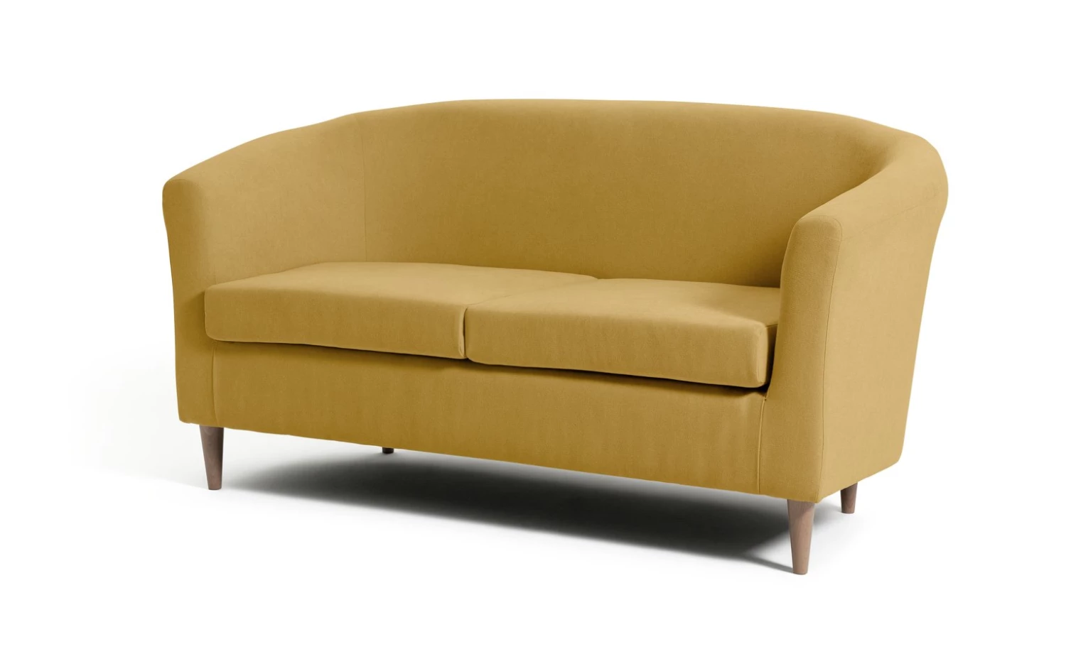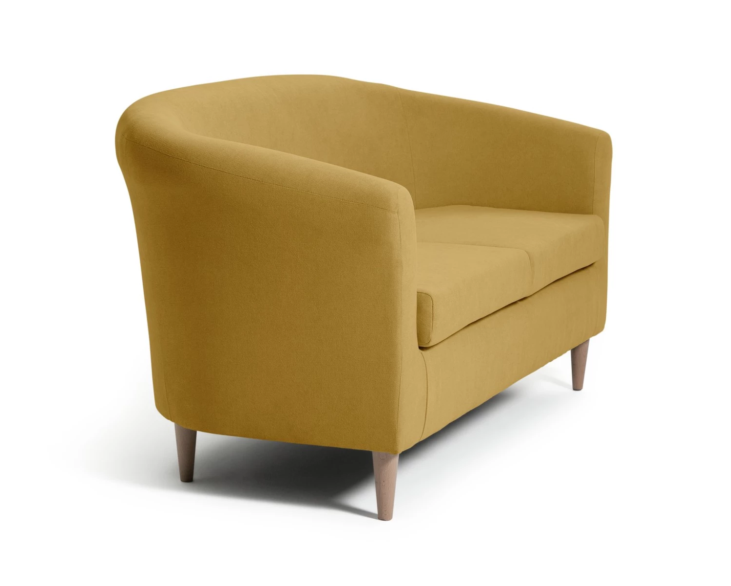 Sink into our 2-seater tub sofa. Soft, rounded edges welcome you like a big hug. With a curvy comfy frame and foam-filled cushions it's made to curl up on. And those tapered wooden feet give this shapely warm yellow couch a modern edge. Make it your own with colourful cushions. Snuggle-time, sorted.
