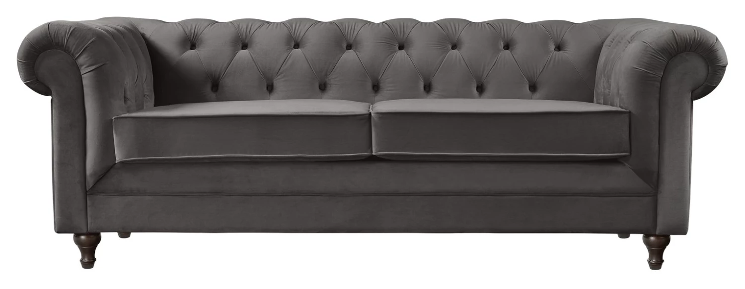 Incredibly iconic. Our Chesterfield sofa is full of character with its upholstered, low deep buttoned back and pleated scroll arm design. It brings a whole new wow factor to a room. Total accent piece in a luxurious velvet style. The split, foam-filled seat offers comfort and a perfect level of firmness to ensure this eye-catching stunner keeps its looks. Shapely, turned feet in solid wood are a final finishing flourish and lift it just off the floor to prevent any scuffing. Forever fashionable.