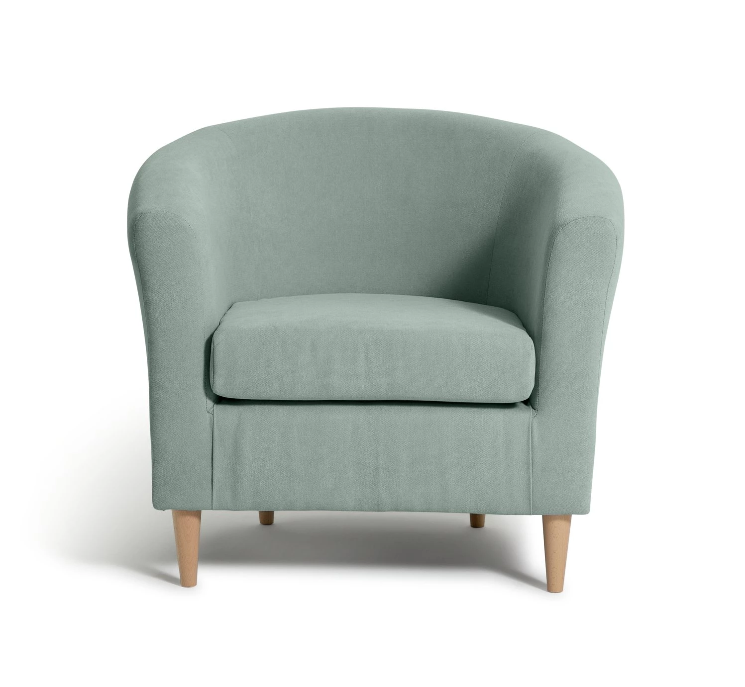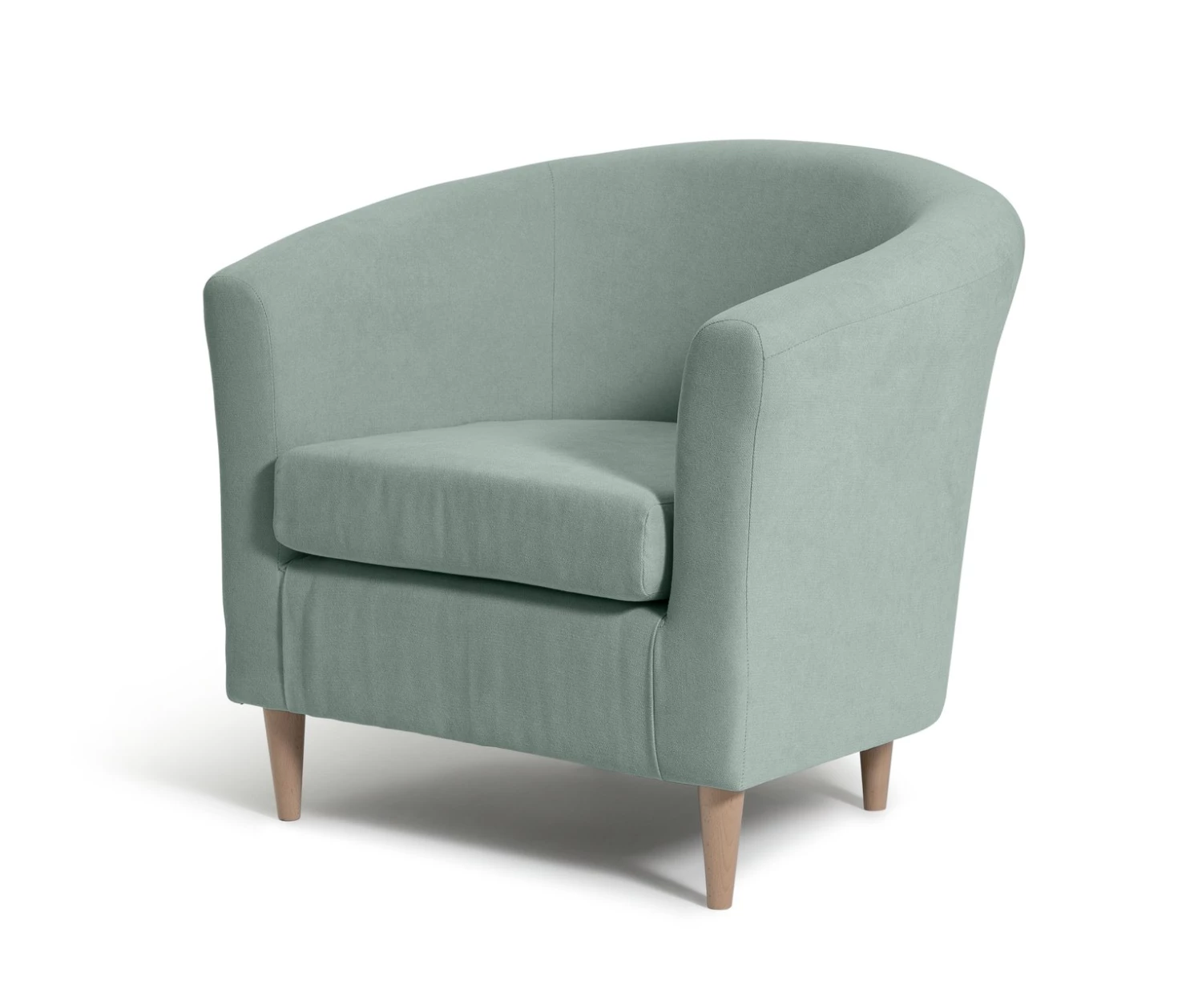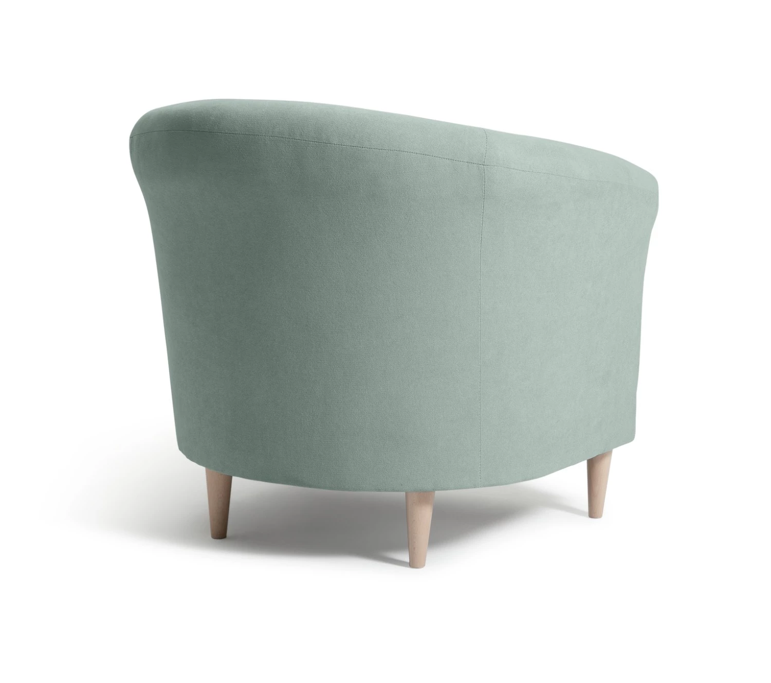 Sink into our blue tub chair. Soft, rounded edges welcome you like a big hug. With a curvy comfy frame and a foam-filled cushion it's made to curl up on. And those tapered wooden feet give this shapely seat a modern edge. Make it your own with colourful cushions. Grab a book and a cuppa, you're sorted.