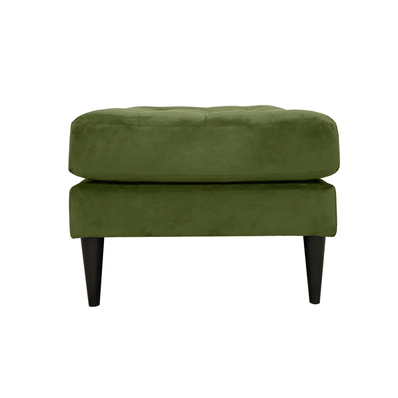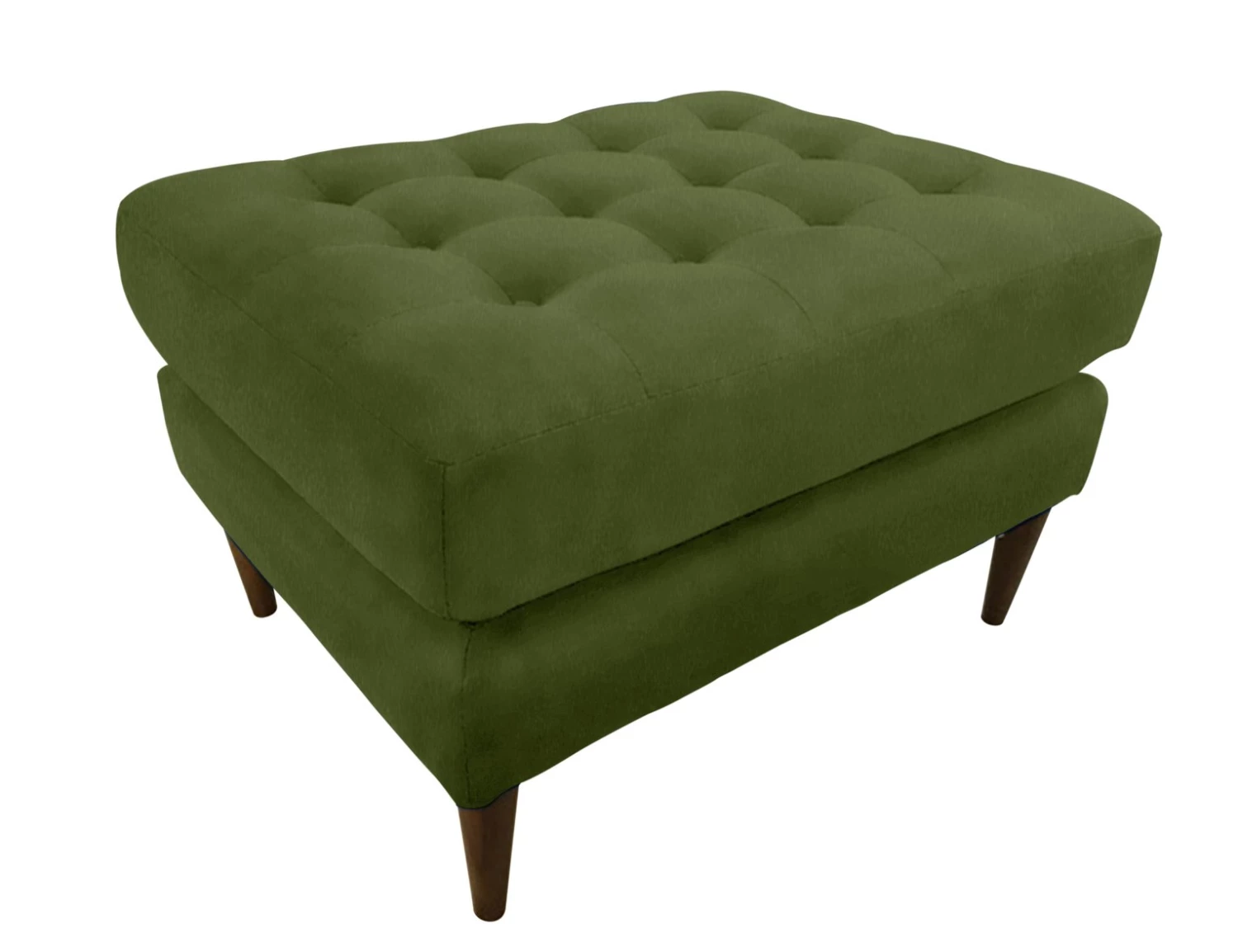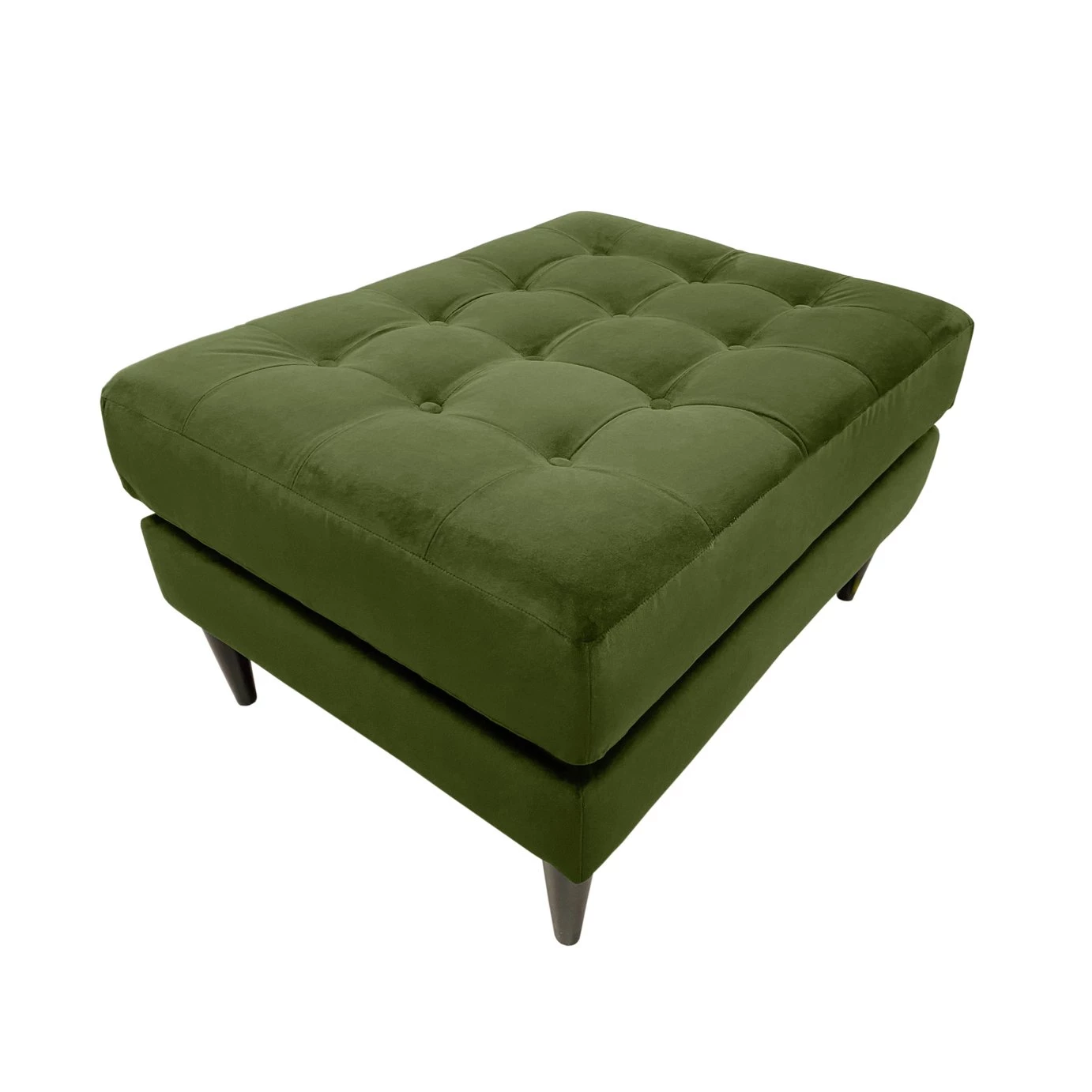 Buttoned, British, Bliss. That's our Hudson. This lush footstool in deep blue creates a soothing setting. Its soft green fabric wows. Handsome Hudson is characterised by its buttoned top. It has a stand-out style that just works. Hudson is raised up on slender wooden feet to give it an elegant edge. Best of British, it's manufactured right here in the UK. A restful treat for your weary feet.