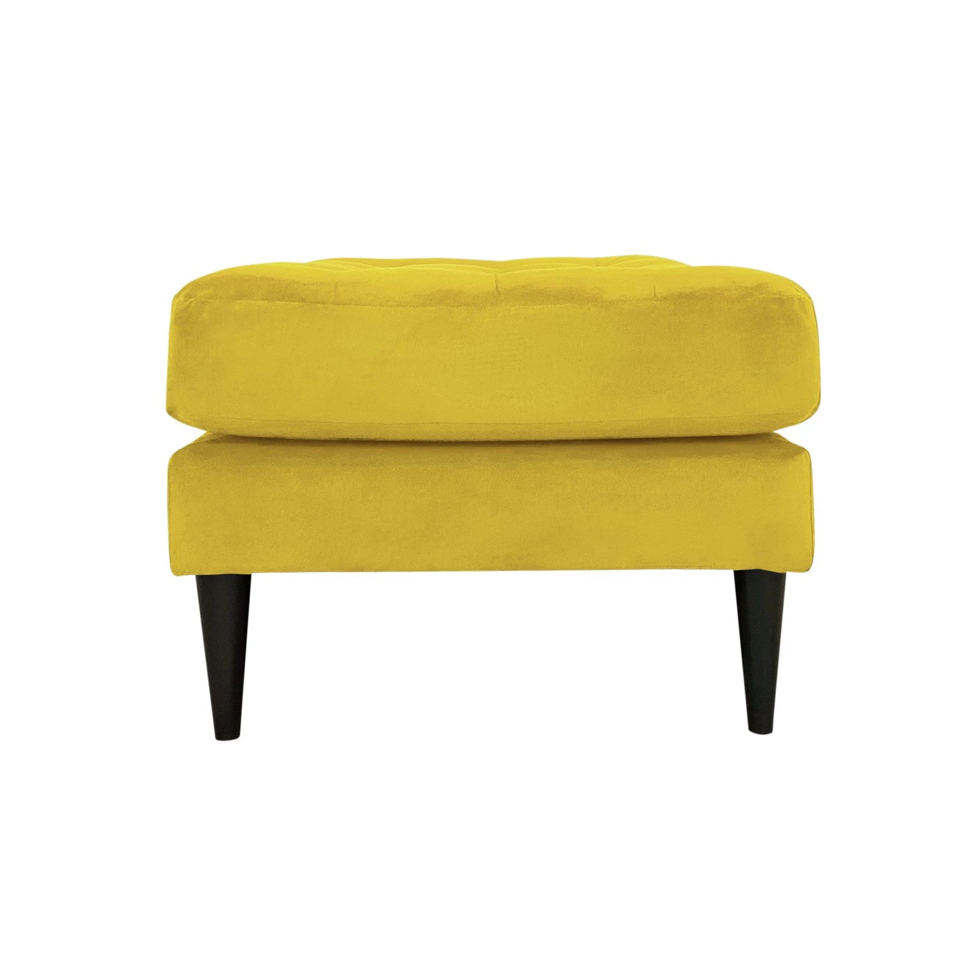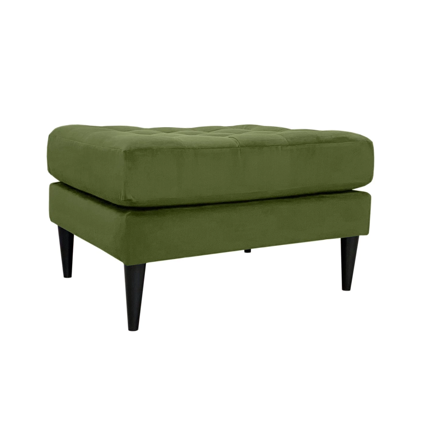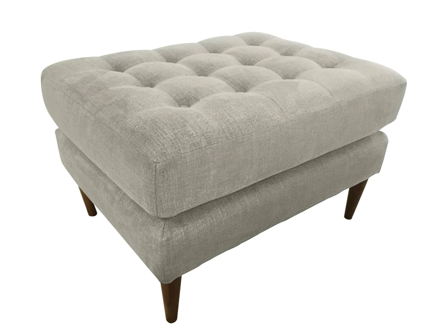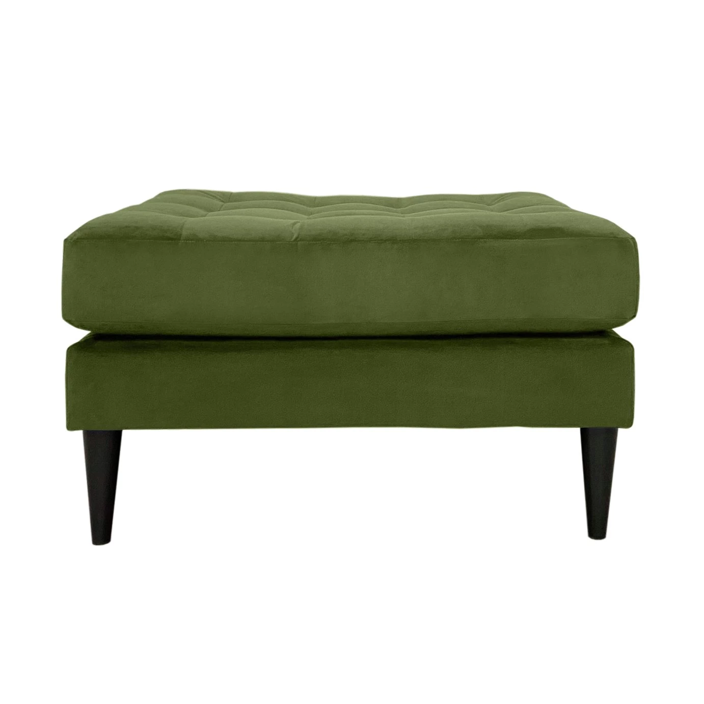 Buttoned, British, Bliss. That's our Hudson. This lush footstool in deep blue creates a soothing setting. Its soft green fabric wows. Handsome Hudson is characterised by its buttoned top. It has a stand-out style that just works. Hudson is raised up on slender wooden feet to give it an elegant edge. Best of British, it's manufactured right here in the UK. A restful treat for your weary feet.